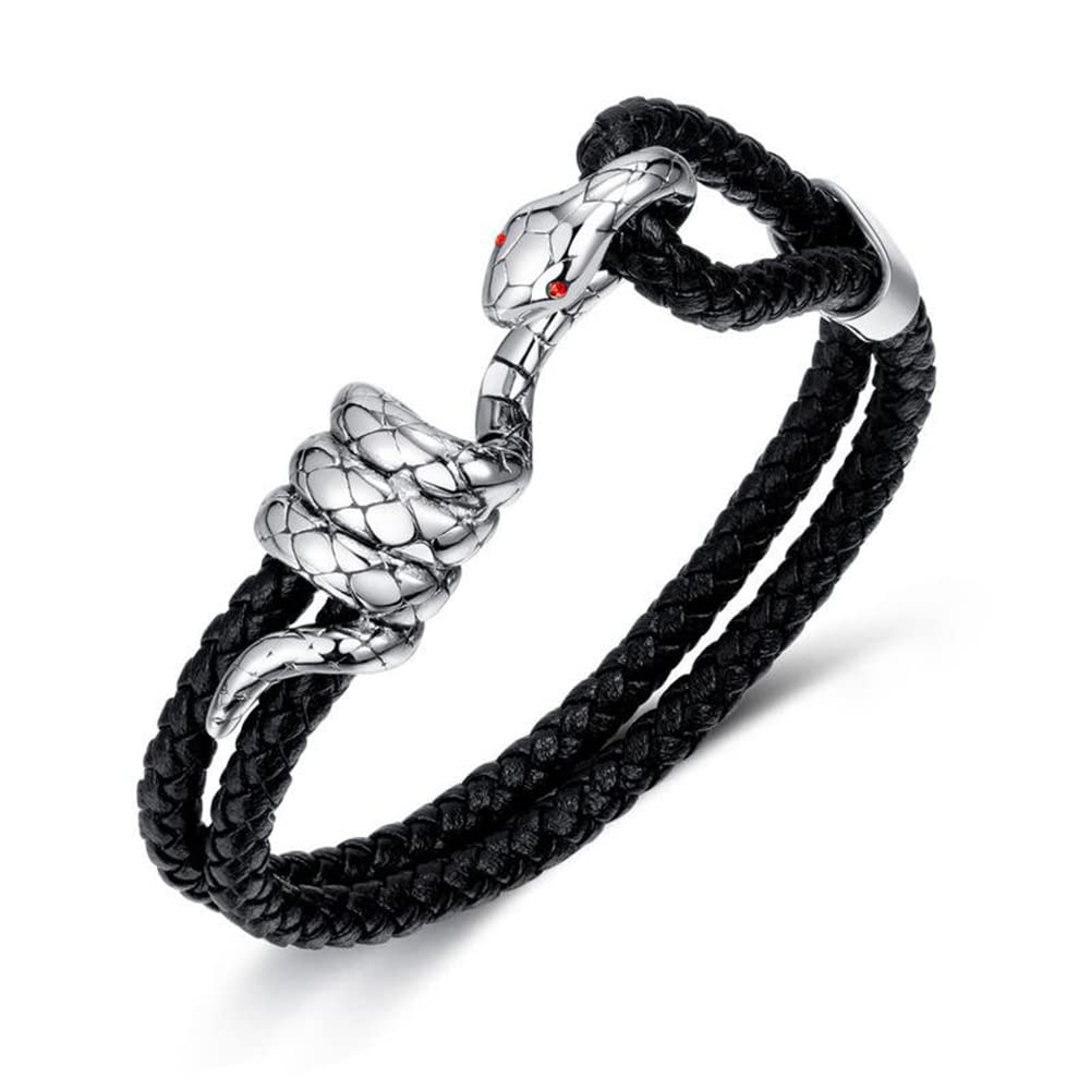 手首に巻きつくのは、ただのブレスレットではなく、鋭い存在感を放つスネークの意志。Rockyuのメンズスネークブレスレットは、編み込み合皮レザーにリアルな蛇のフォルムを象ったステンレスパーツが組み合わさった、男心をくすぐる逸品。目元にはレッドのポイントが入り、さりげない毒気とミステリアスな魅力を添えます。