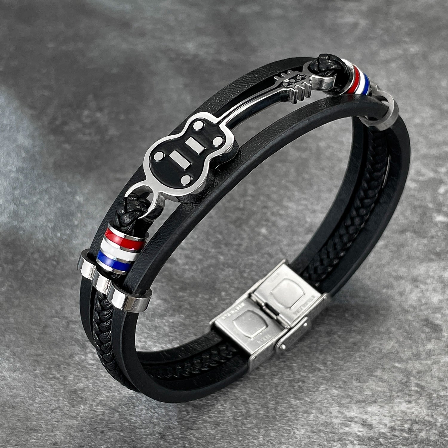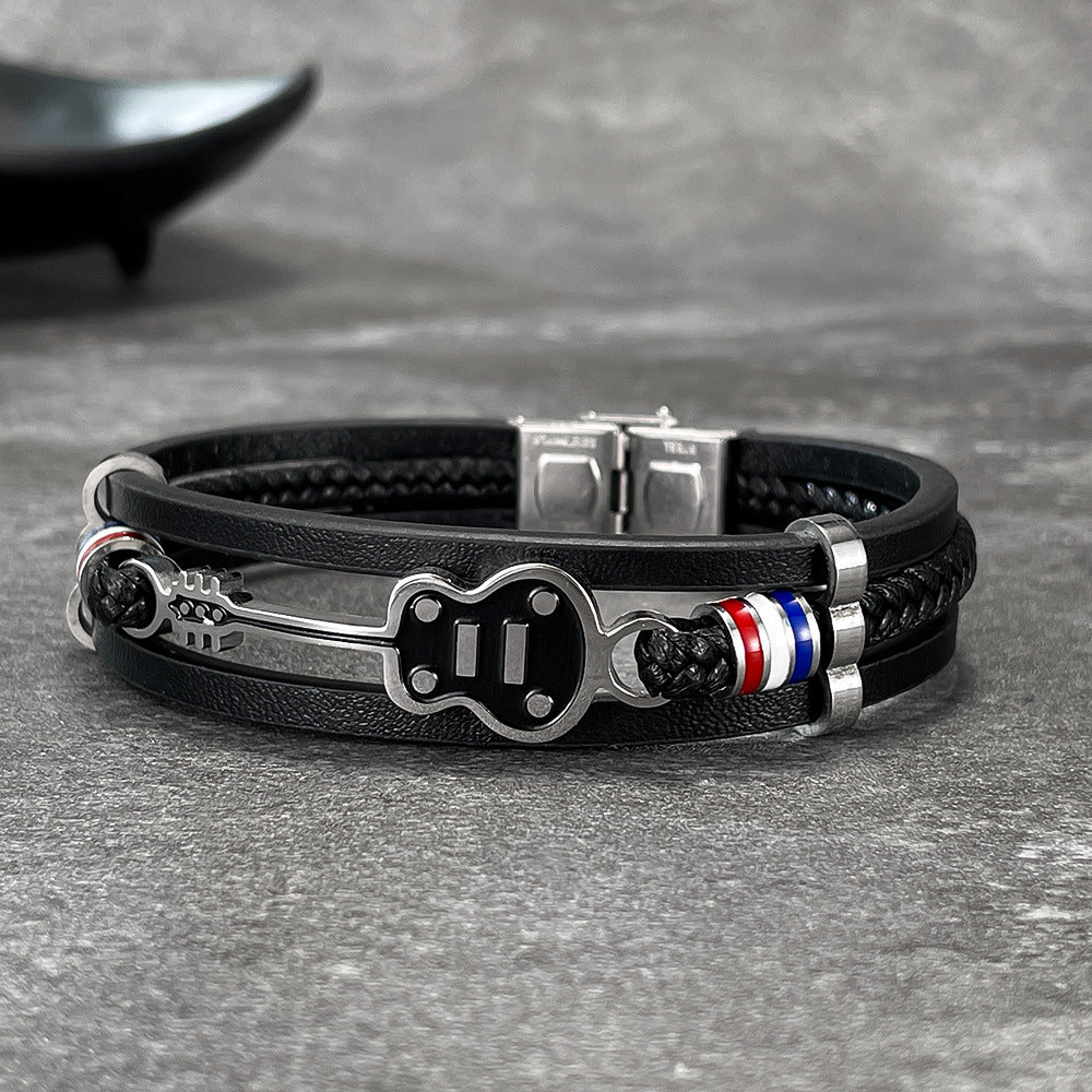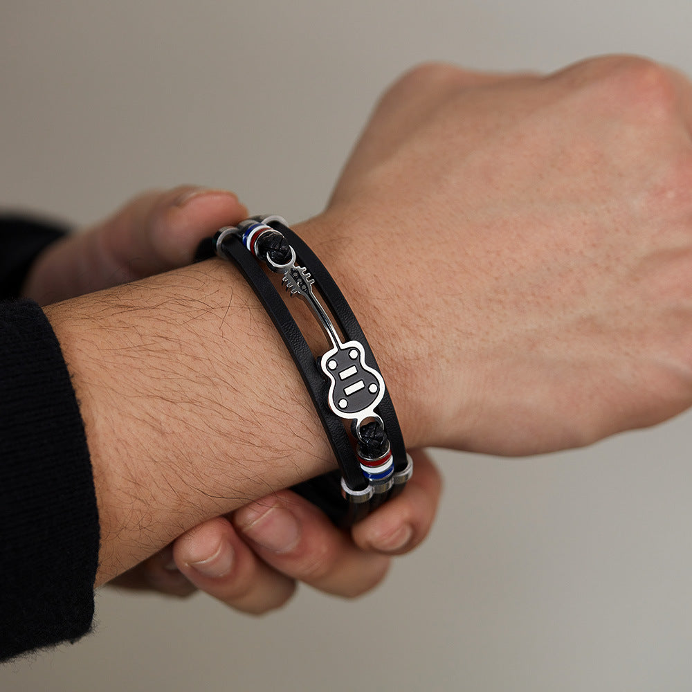 音楽を愛するあなたに捧ぐ、Rockyuの音楽モチーフブレスレット。中央に配置されたギターデザインが、ロック魂をさりげなく主張。ブラックPUレザーと高品質ステンレスのコンビネーションが、大人の遊び心と洗練された個性を演出します。