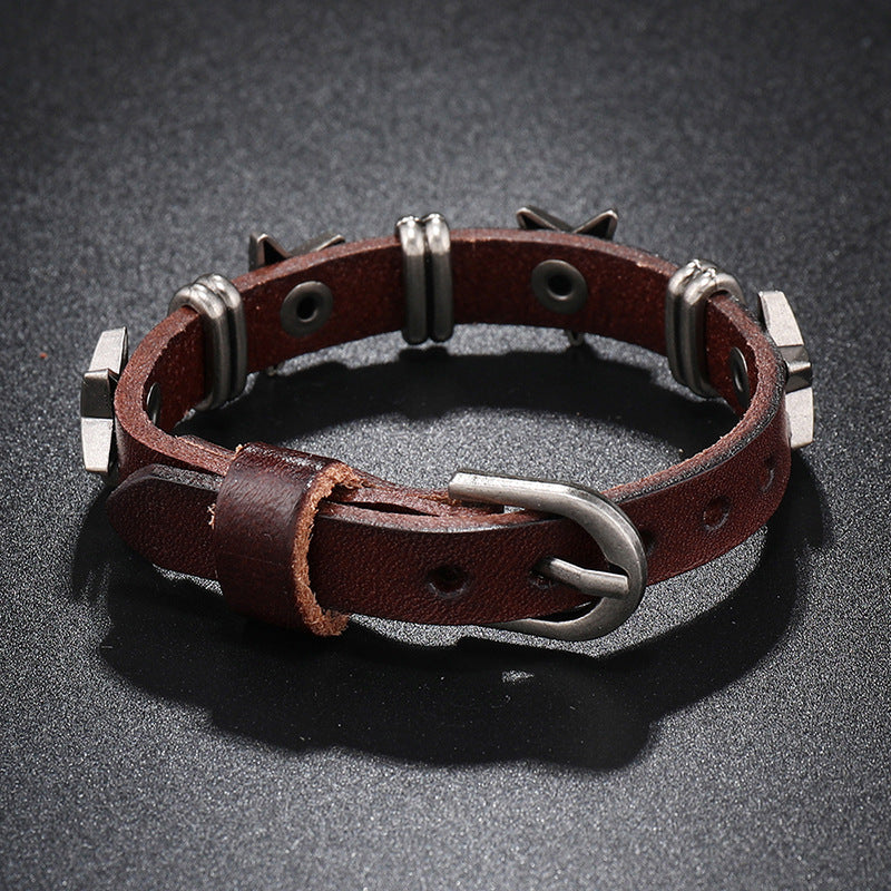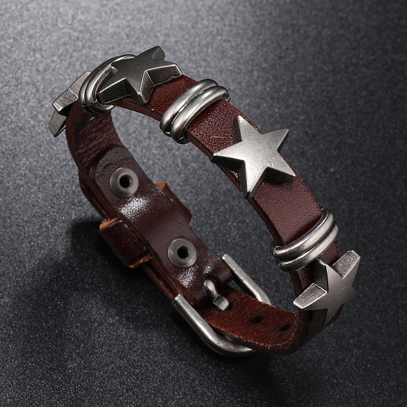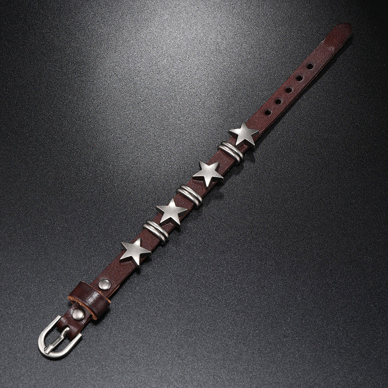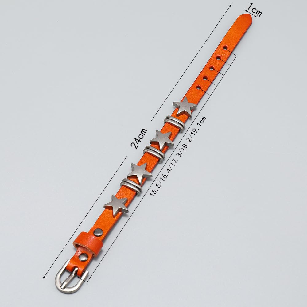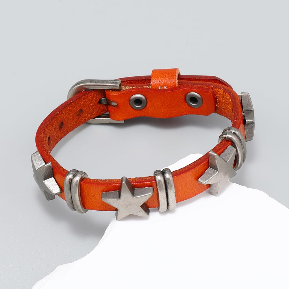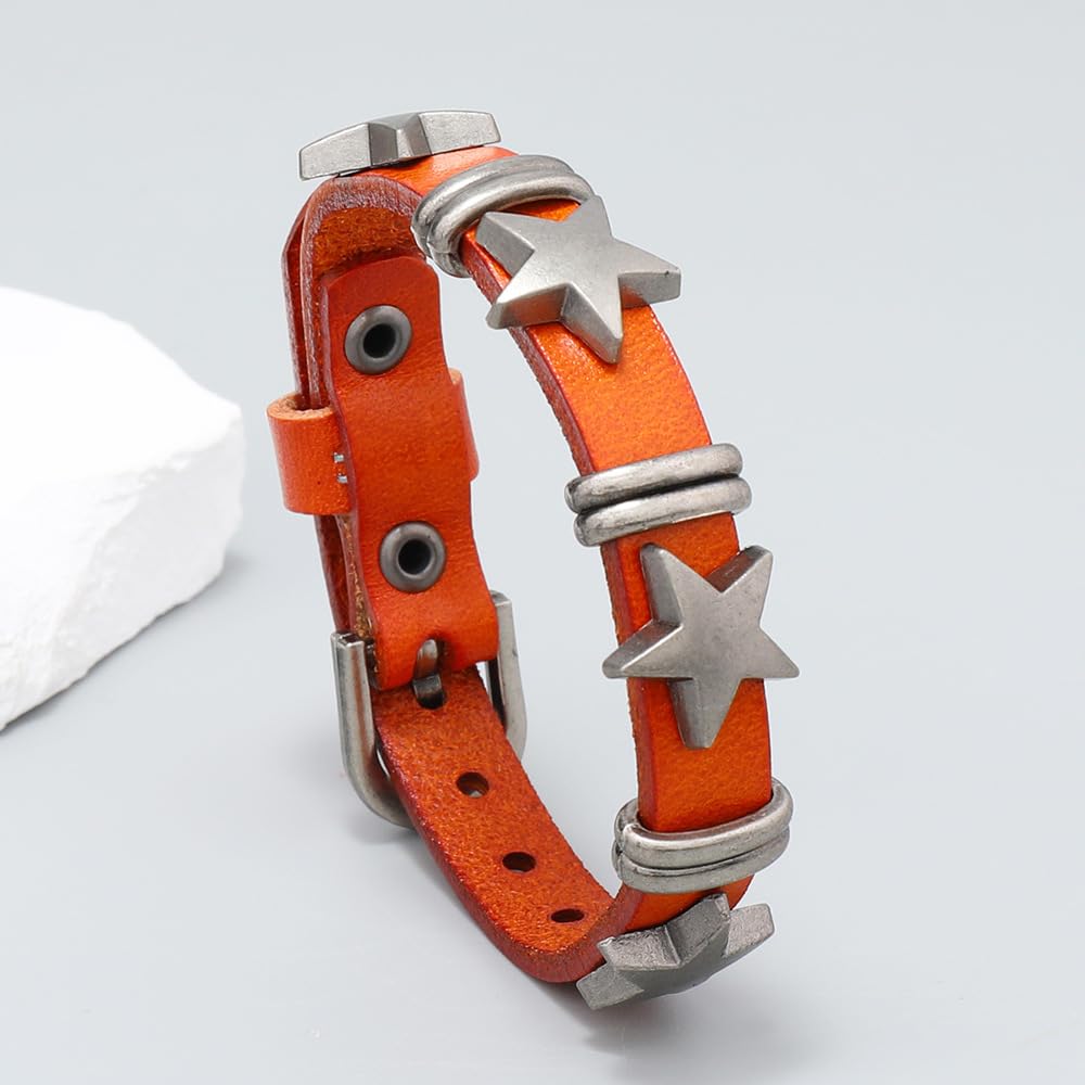 Rockyuが贈る、星型スタッズが存在感を放つパンク&ヴィンテージ風レザーブレスレット。幅1cmのスリムな牛革ベルトに、重厚感あるメタルスターとリングパーツを大胆に配置。長さは24cmで複数の穴があり、手首サイズに合わせて調節可能。赤・黒・オレンジ・ブラウンの豊富なカラーバリエーションで、コーディネートや気分に合わせて選べます。ハンドメイドならではの質感と経年変化が楽しめ、ストリート系やロックファッション、カジュアルコーデのアクセントに最適。誕生日や記念日のギフトとしても、個性的で喜ばれる逸品です。