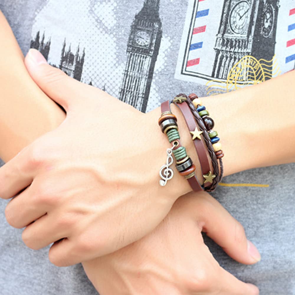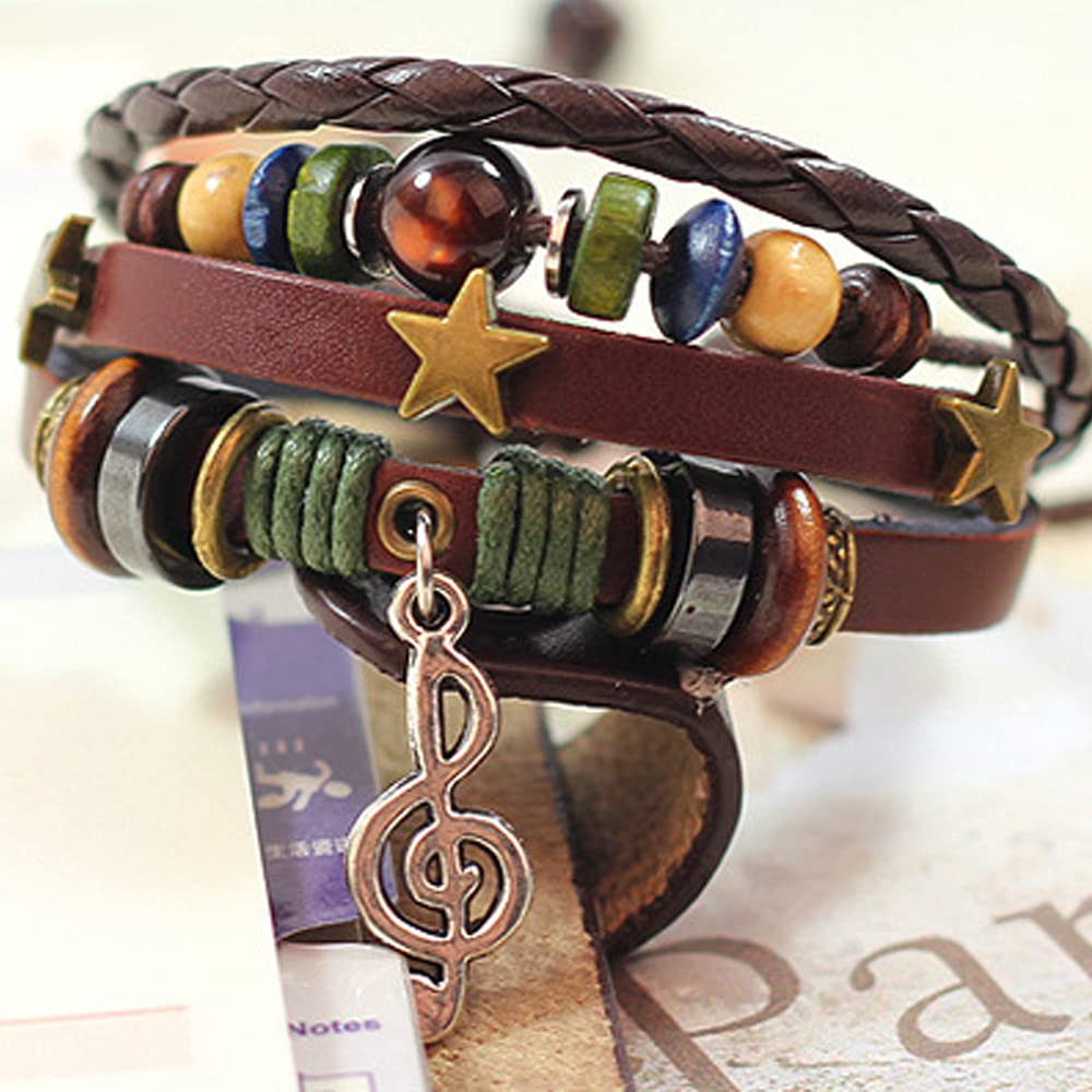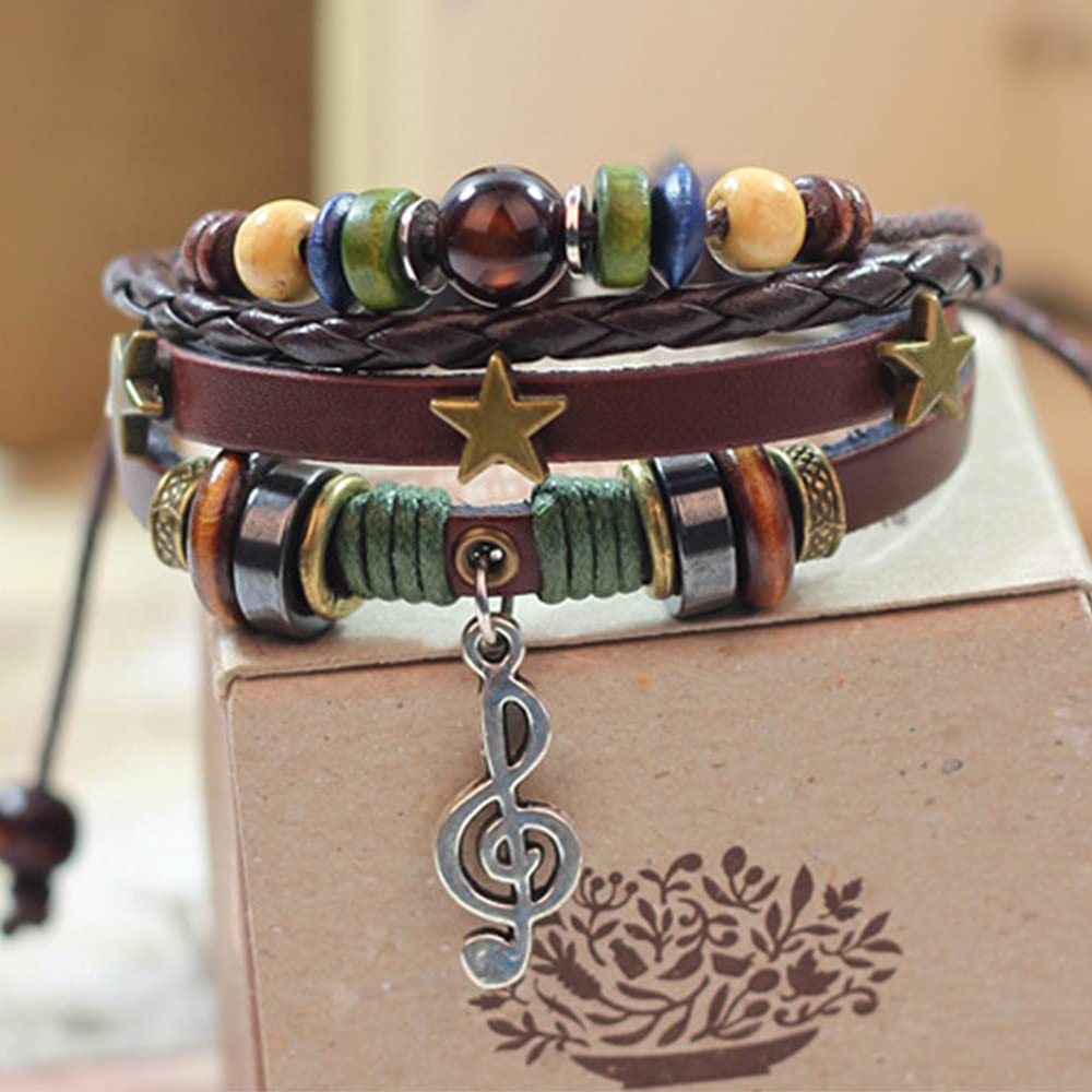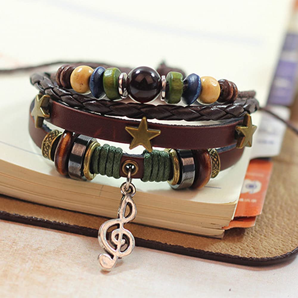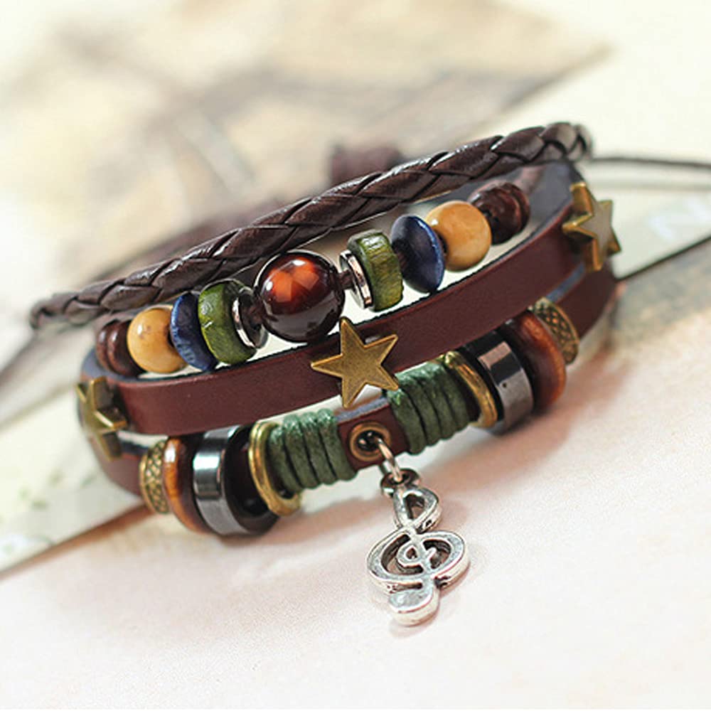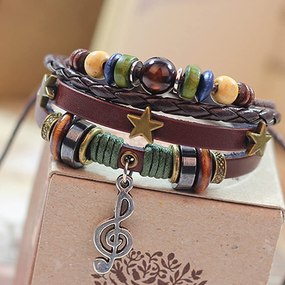Rockyu ブレスレット メンズ レディース レザー 多連 星モチーフ 音符ペンダント 本革 編み込み ブラウン 数珠風 おしゃれ アクセサリー ギフト