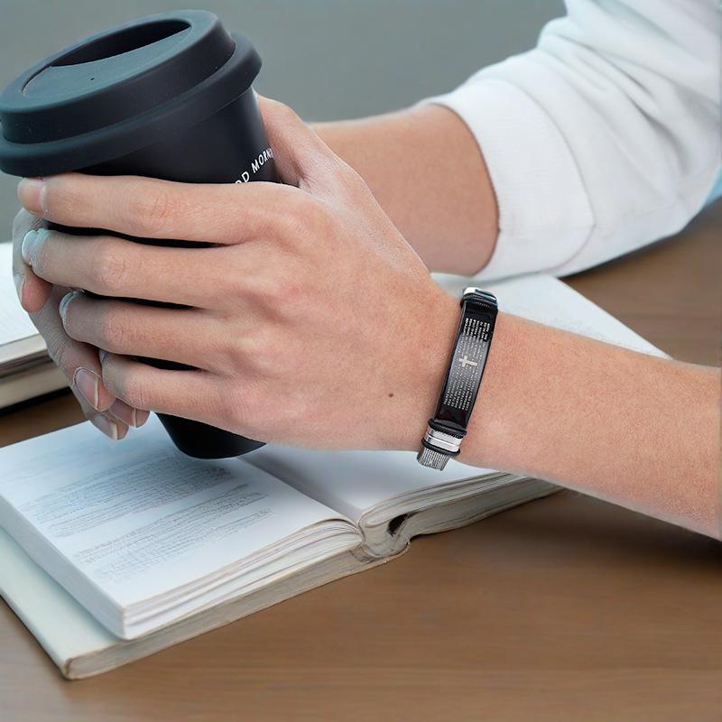 Rockyu が贈る、信念とスタイルを両立するステンレス製ブレスレット。プレート部分には「主の祈り(The Lord’s Prayer)」が繊細に刻まれ、中央のクロスとともに神聖な存在感を放ちます。IPブラック加工の重厚なプレートと高光沢ステンレスメッシュバンドが、洗練された男らしさを演出。長さは17〜22cmで調整可能だから、メンズはもちろん女性の手首にもスマートにフィットします。重さ24gでしっかりとしたつけ心地ながら、軽やかさも兼ね備えた絶妙なバランス。Rockyu のクラフトマンシップが光るこのアイテムは、ファッション性と信仰心を両立させたい方にぴったりの逸品。自分へのご褒美や、大切な人へのプレゼントとしてもおすすめです。