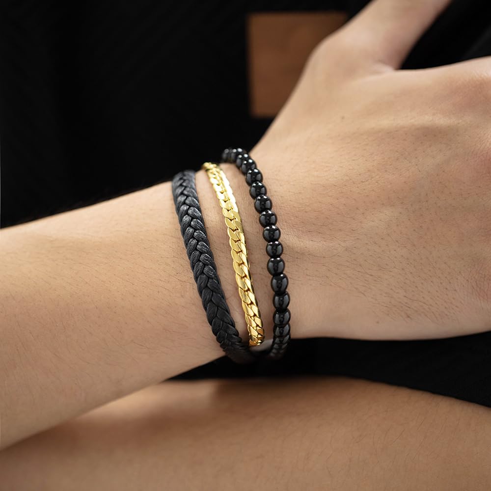 Rockyuが放つ、大人の手元を輝かせる3連ブレスレット。ブラックのビーズチェーン、編み込みレザー、そして存在感抜群のゴールド喜平チェーンが織り成す贅沢なコンビネーションは、視線を奪うこと間違いなし。