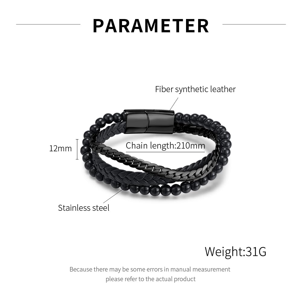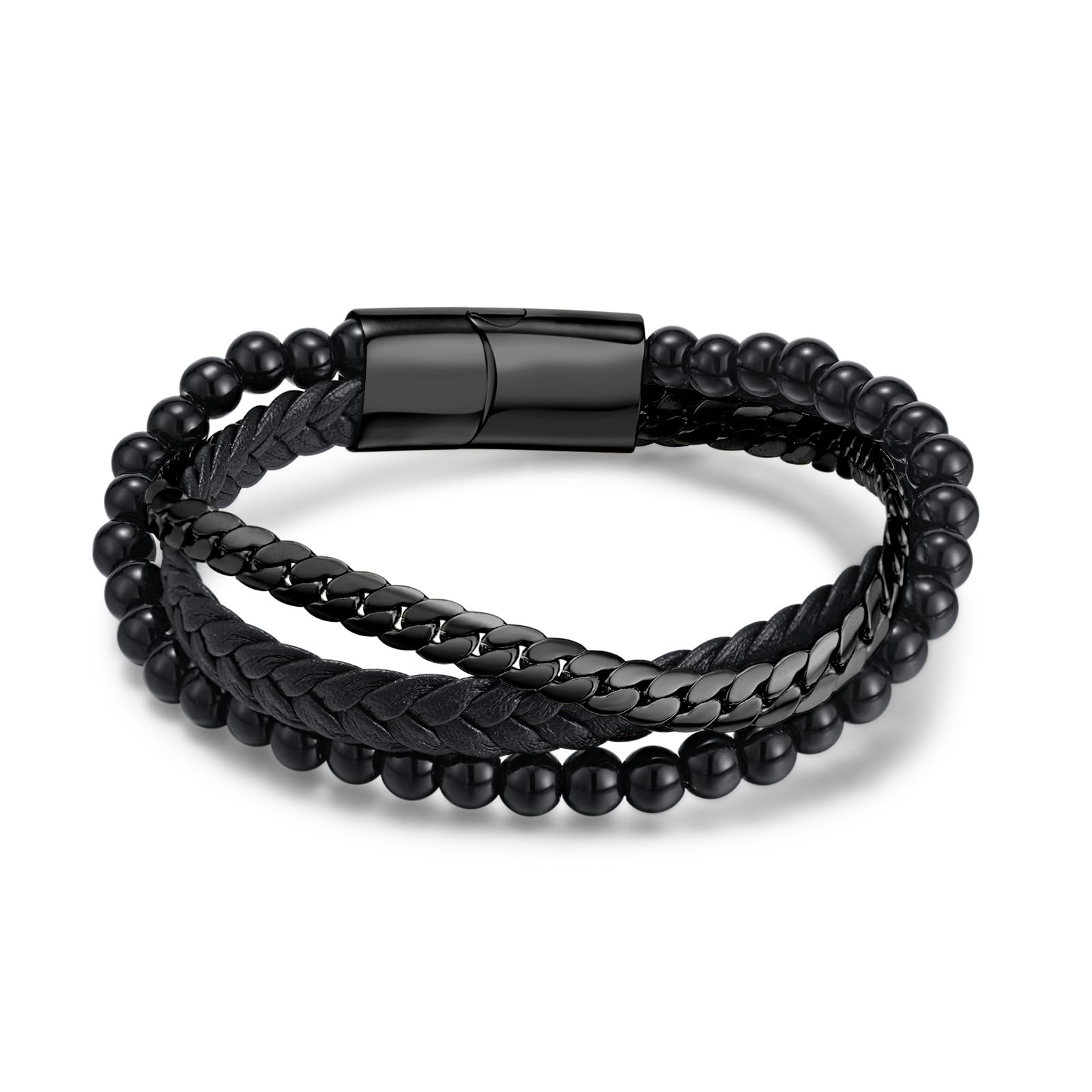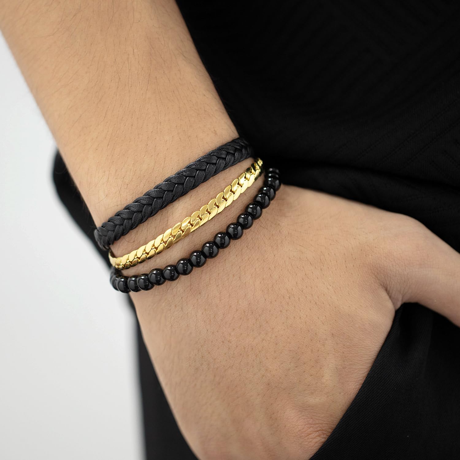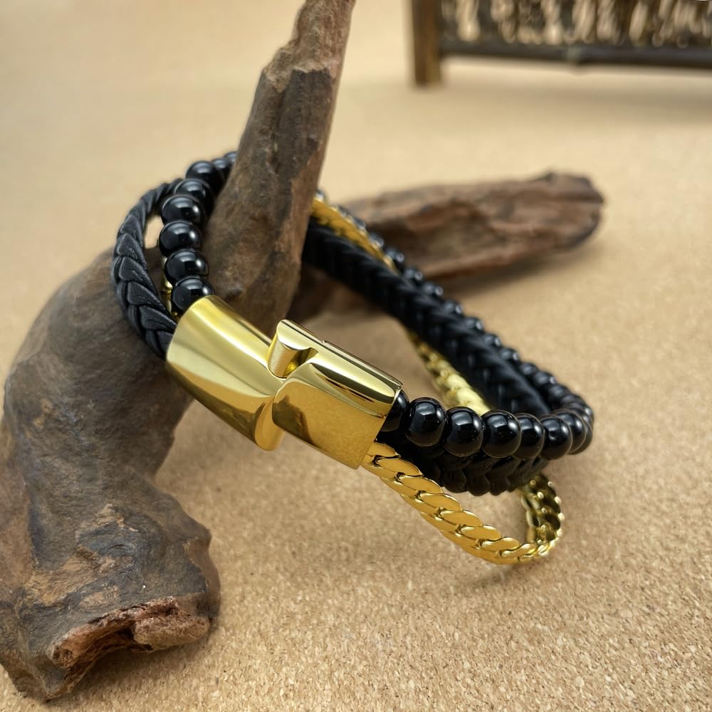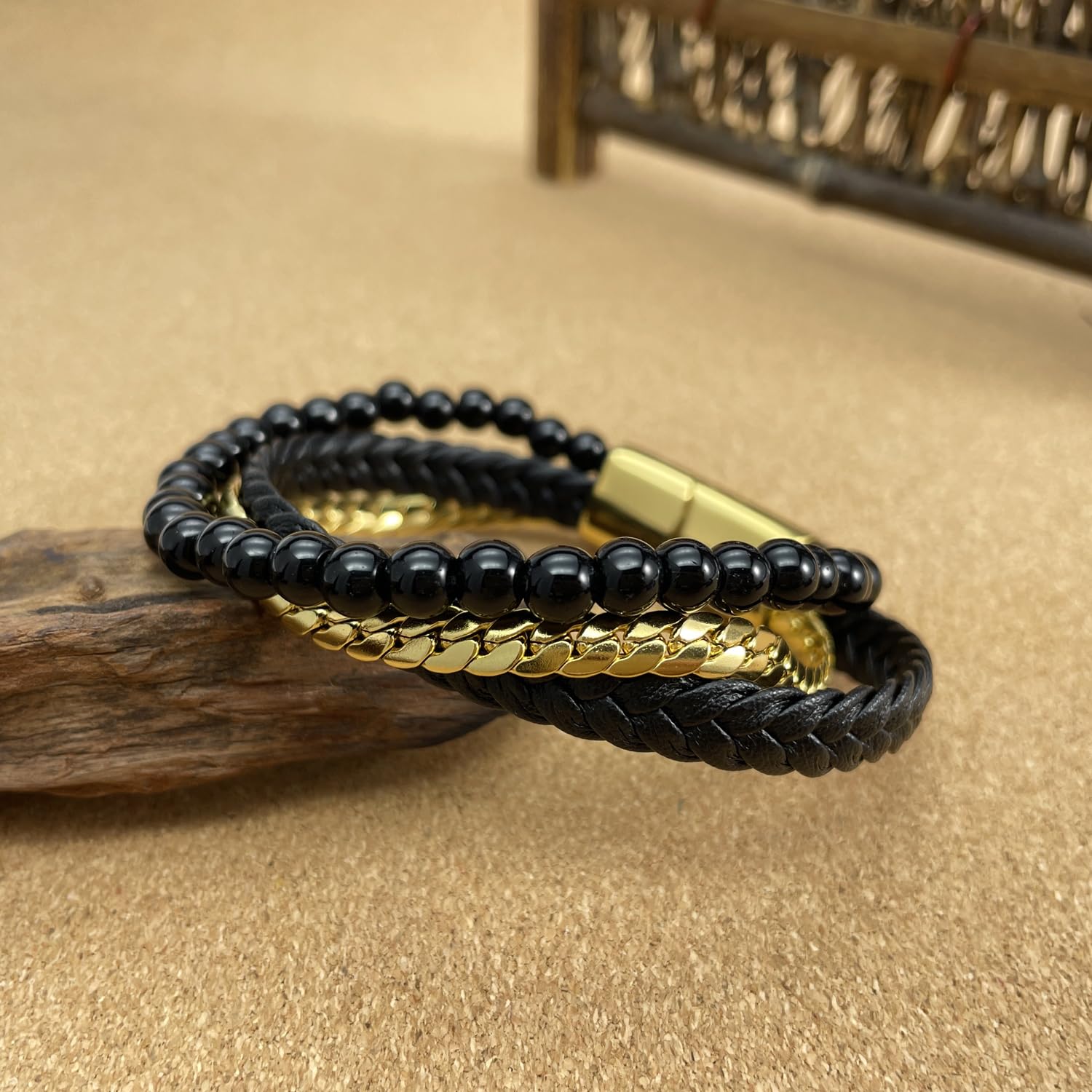 Rockyu メンズ 3連ブレスレット 喜平チェーン×ビーズ×編み込みレザー ゴールド×ブラック ステンレス 金属アレルギー対応