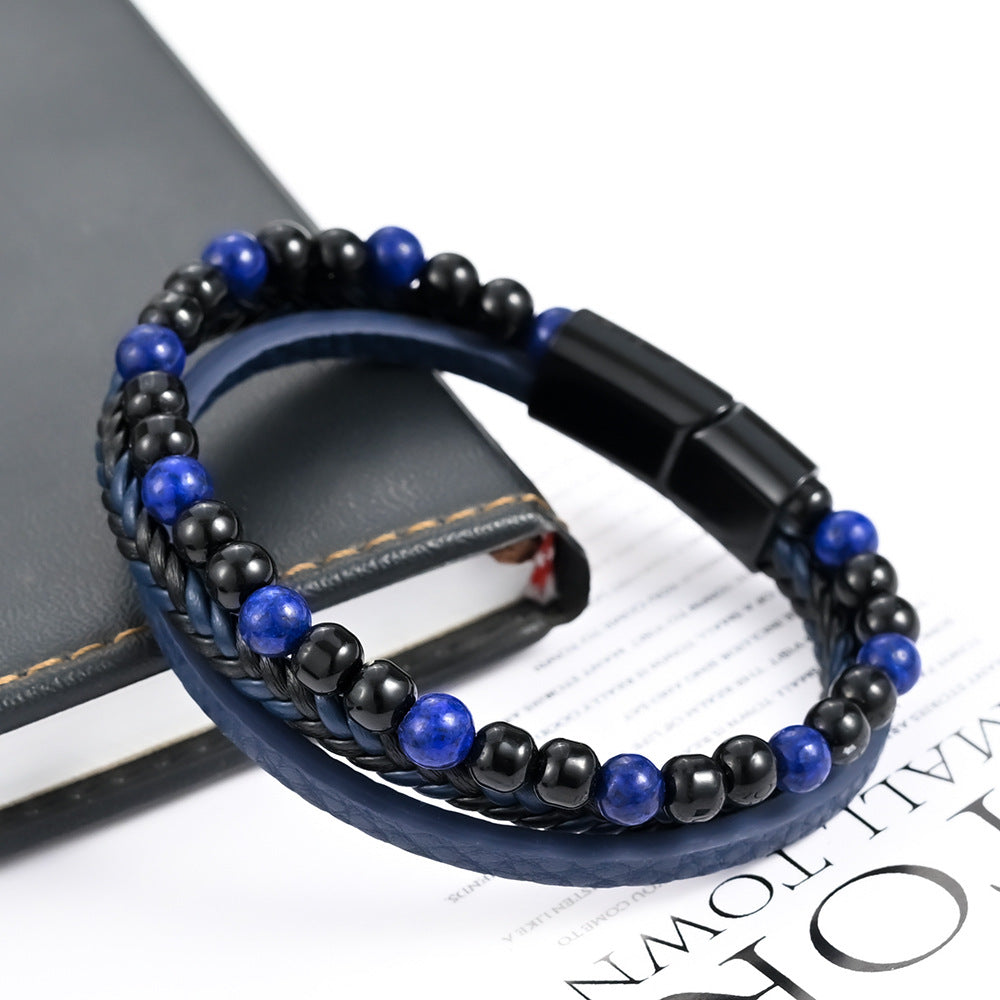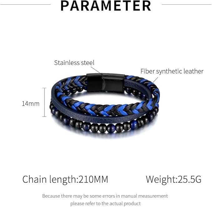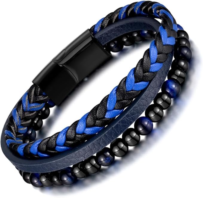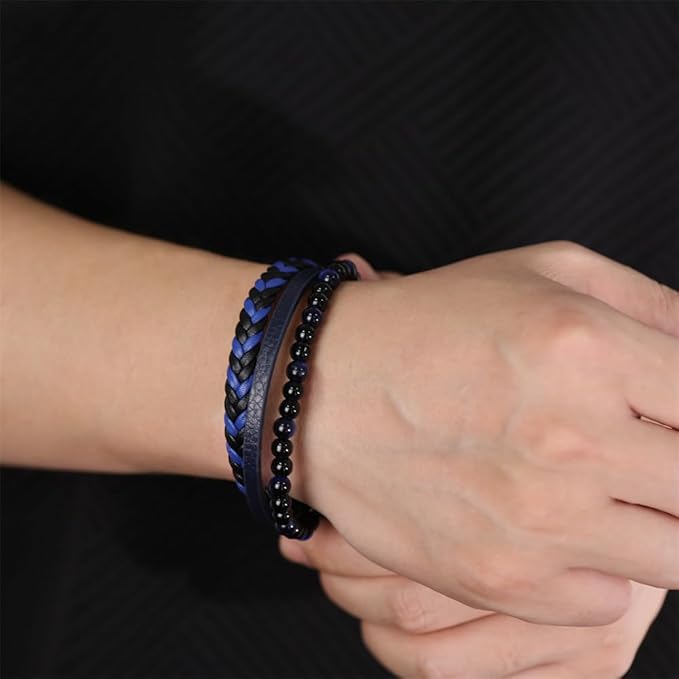 Rockyuのメンズ3連ブレスレットは、編み込みレザー・天然石風ビーズ・フラットレザーの3種類の素材を組み合わせた立体的なデザイン。ブルーとブラックのコントラストが手元をスタイリッシュに演出します。留め具には高品質ステンレス製マグネットクラスプを採用し、片手で簡単に着脱可能。合成繊維レザーを使用しており、軽量かつ耐久性に優れています。カジュアルコーデやきれいめスタイルのアクセントにぴったりで、金属アレルギーにも対応。誕生日や記念日のギフトにもおすすめです。