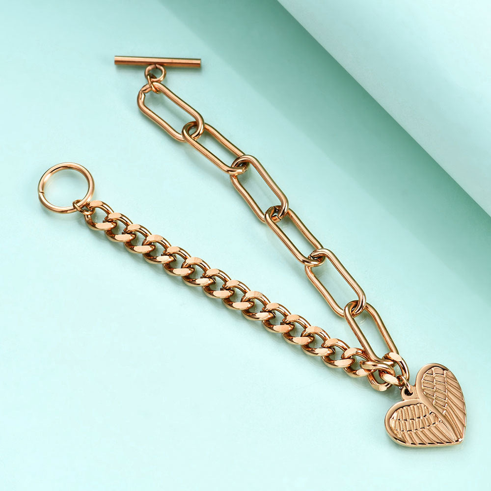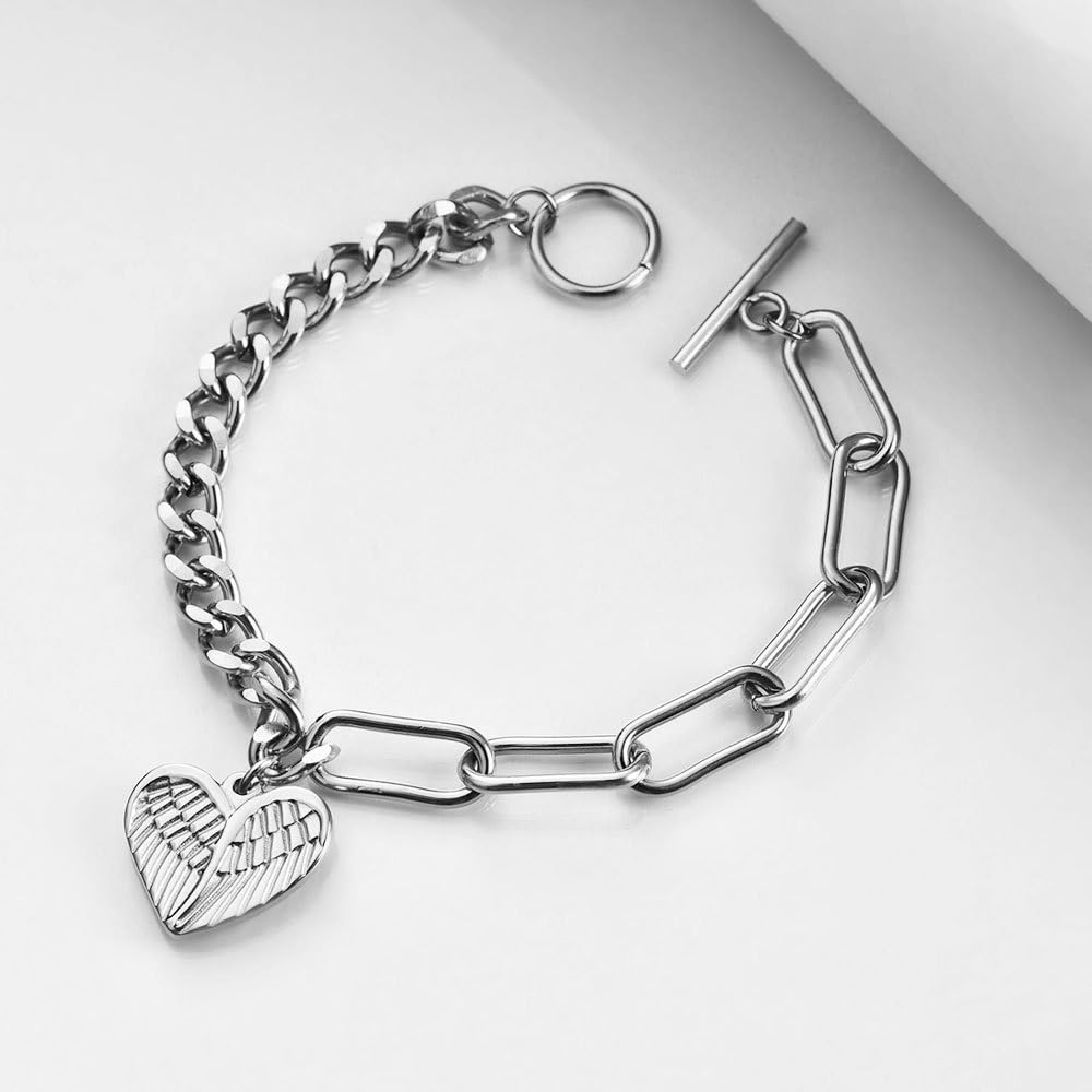 天使の羽が、そっと手元に舞い降りた。Rockyuの人気レディースブレスレットは、ハート型チャームに繊細な“翼”を刻んだロマンティックなデザイン。エッジの効いたOTチェーンとの組み合わせで、甘さとクールさのバランスが絶妙。