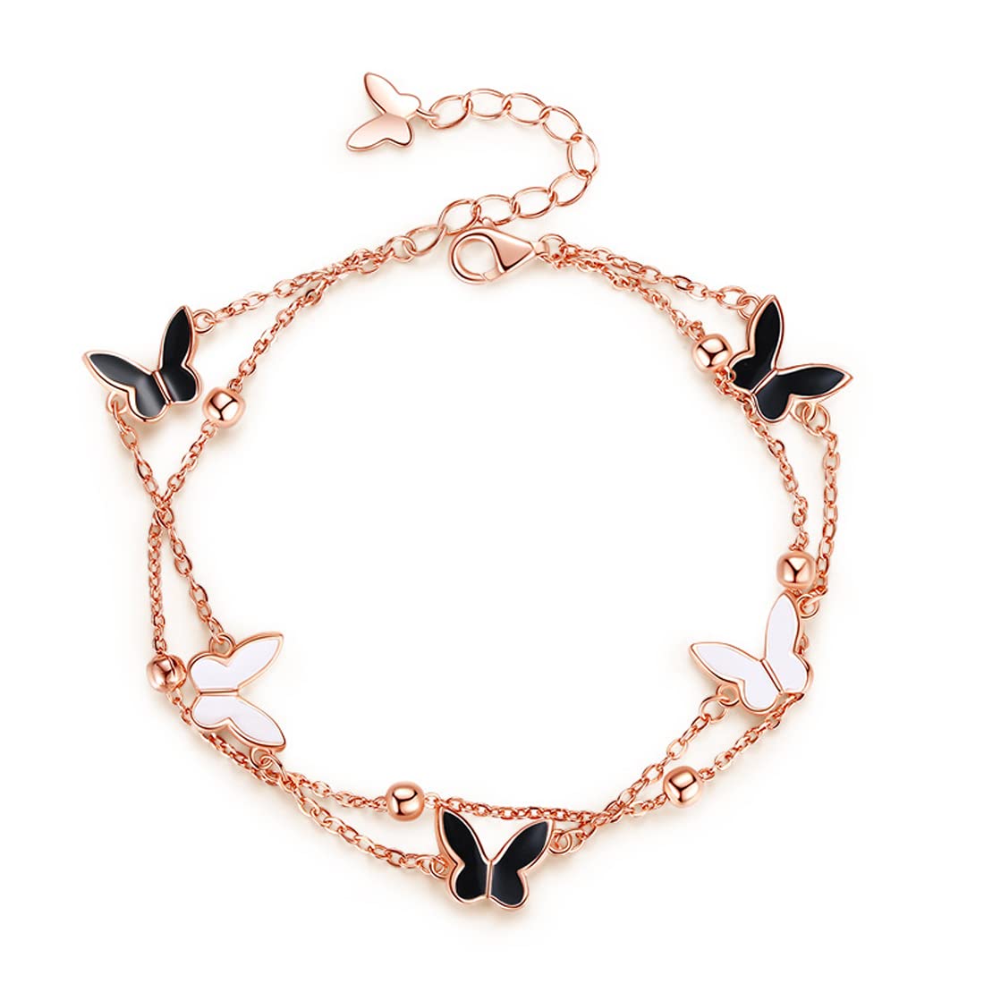 Rockyu ブレスレット レディース ピンクゴールド 18k エナメル 蝶々 バタフライブレスレット 二連チェーン 昆虫モチーフ誕生日 記念日 おしゃれ アクセサリー