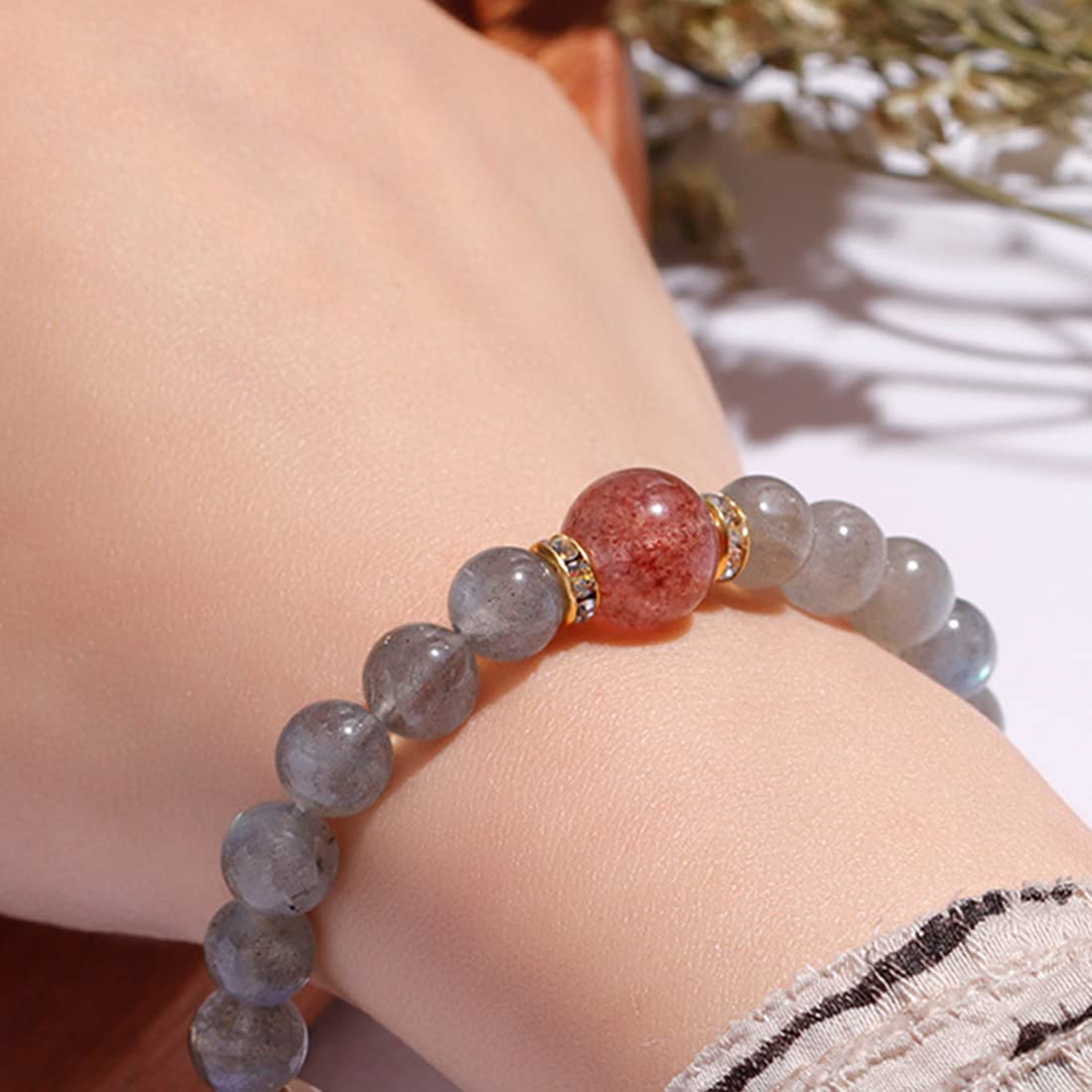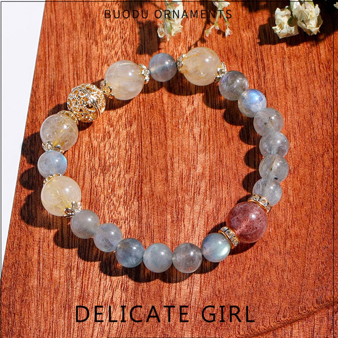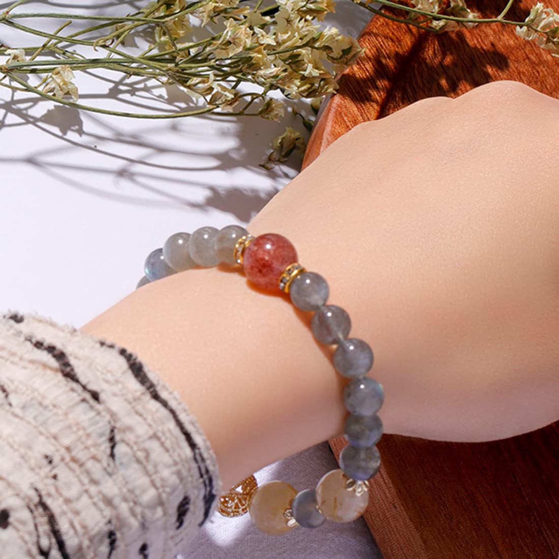 ブルーグレーに輝くラブラドライト風のクリスタルと、金糸のように美しく内包物が走るルチルクォーツを組み合わせた、まるで宇宙を手首にまとったような逸品。赤みがかった一粒石がアクセントになり、あなたの魅力をさりげなく引き立てます。