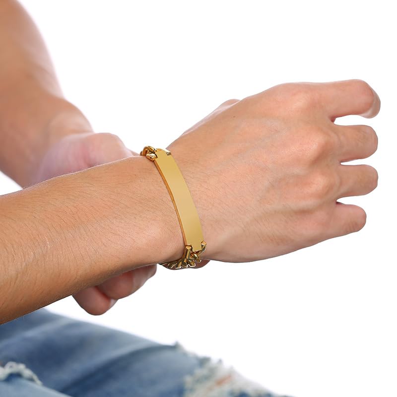 Rockyuから、王道×洗練を極めたプレートチェーンブレスレットが登場。9mm幅の喜平チェーンに、52mmのミニマルなプレートを組み合わせた、どんなスタイルにもなじむ万能デザイン。光沢のあるIPゴールドコーティング仕上げで、手元にラグジュアリーな輝きをプラスします。
