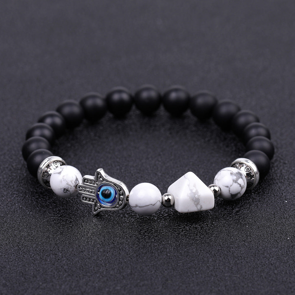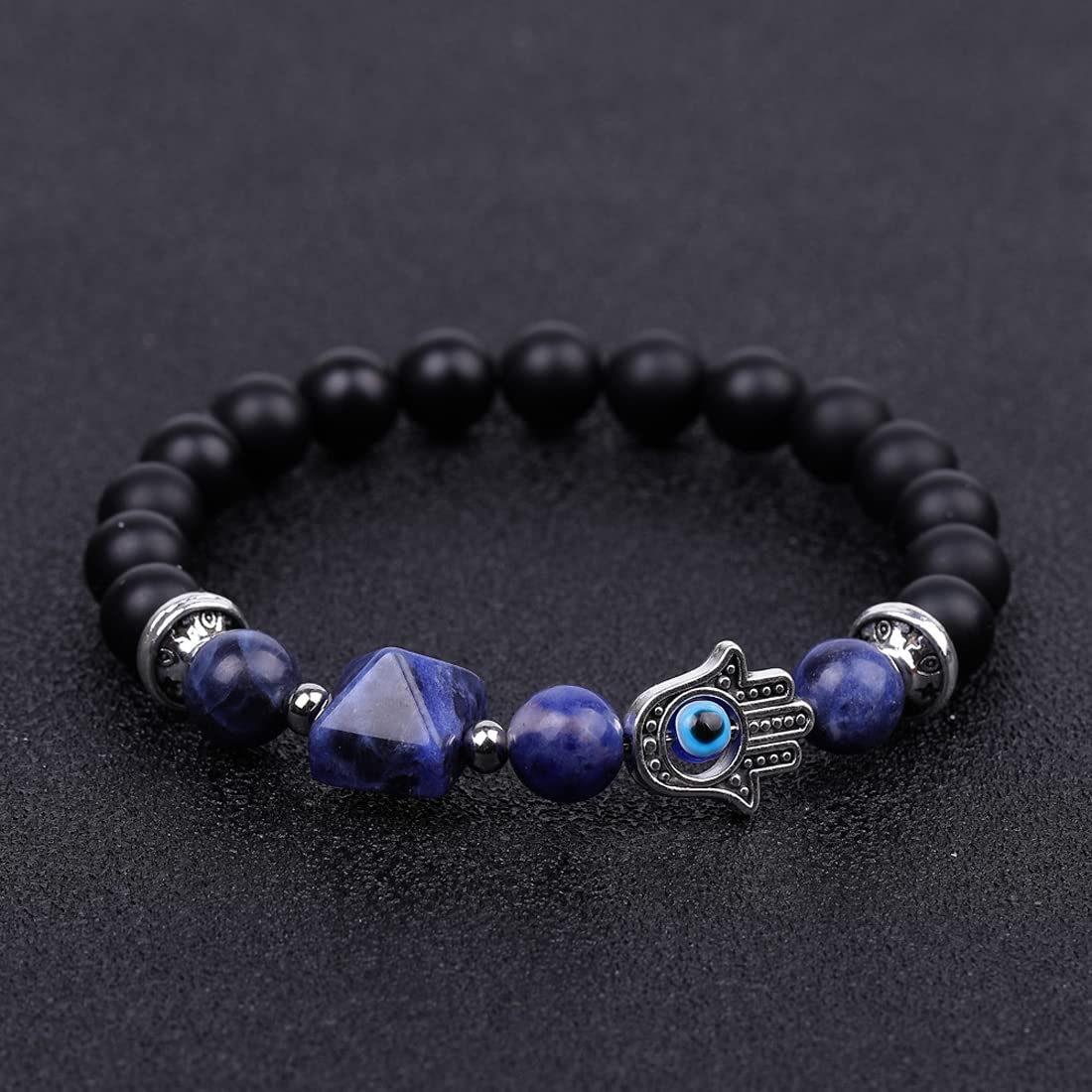 Rockyuのハムサの手ブレスレットは、オニキスをベースに天然石を組み合わせた存在感あるデザイン。ハムサの手モチーフは古くから幸運と守護の象徴とされ、ブルーの目の装飾が邪気を払うといわれています。各天然石には個性豊かな色合いと意味があり、日常使いはもちろん、大切なイベントにも映えるアクセサリーです。長さ約18.5cm、重量約22gで程よいフィット感。ゴム仕様で着脱しやすく、男女問わず使えるユニセックスデザイン。自分用のお守りとしても、誕生日や記念日のプレゼントとしても喜ばれます。カジュアルからフォーマルまで幅広くコーディネートに取り入れられる、魅力と意味を兼ね備えたブレスレットです。