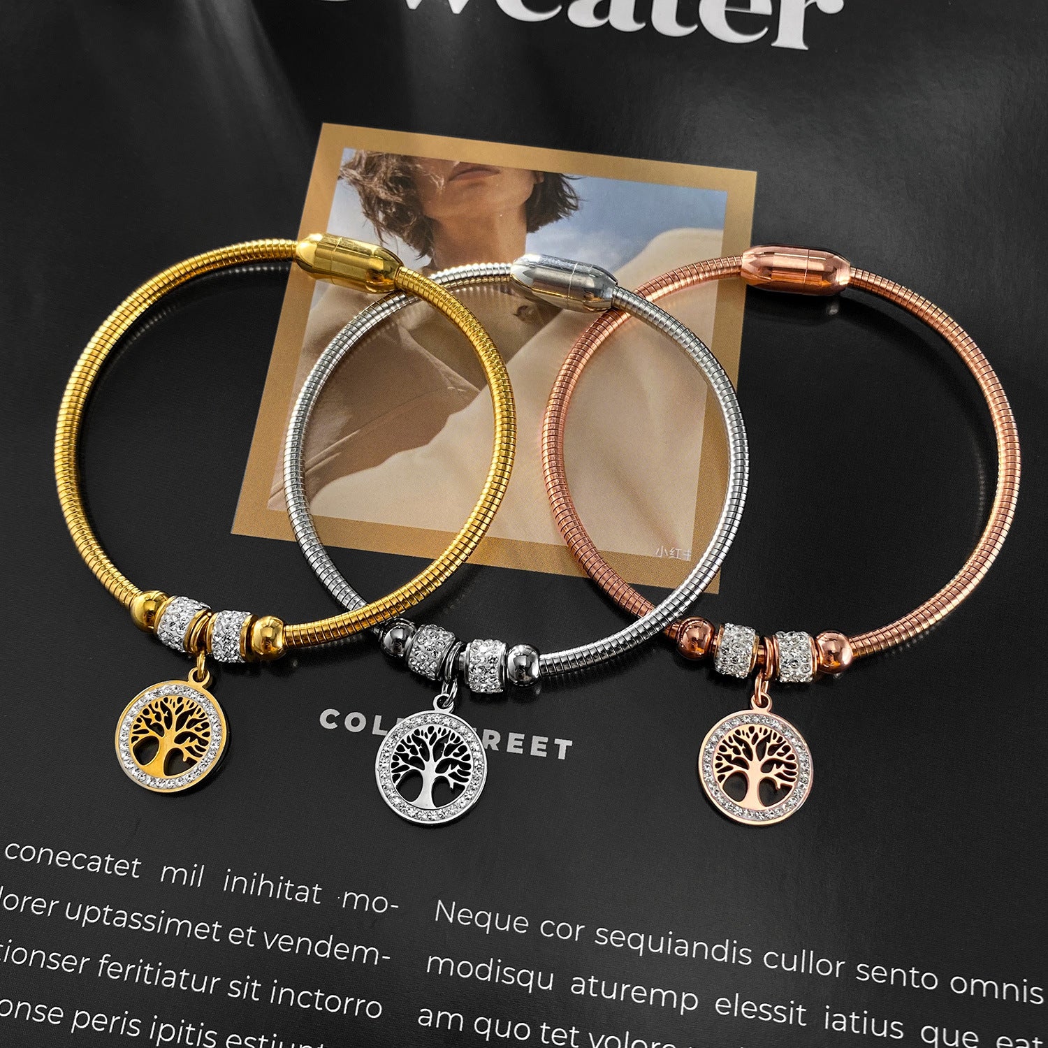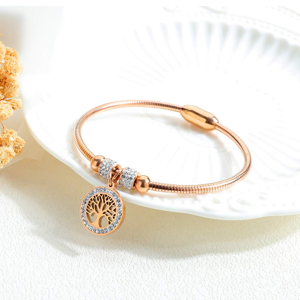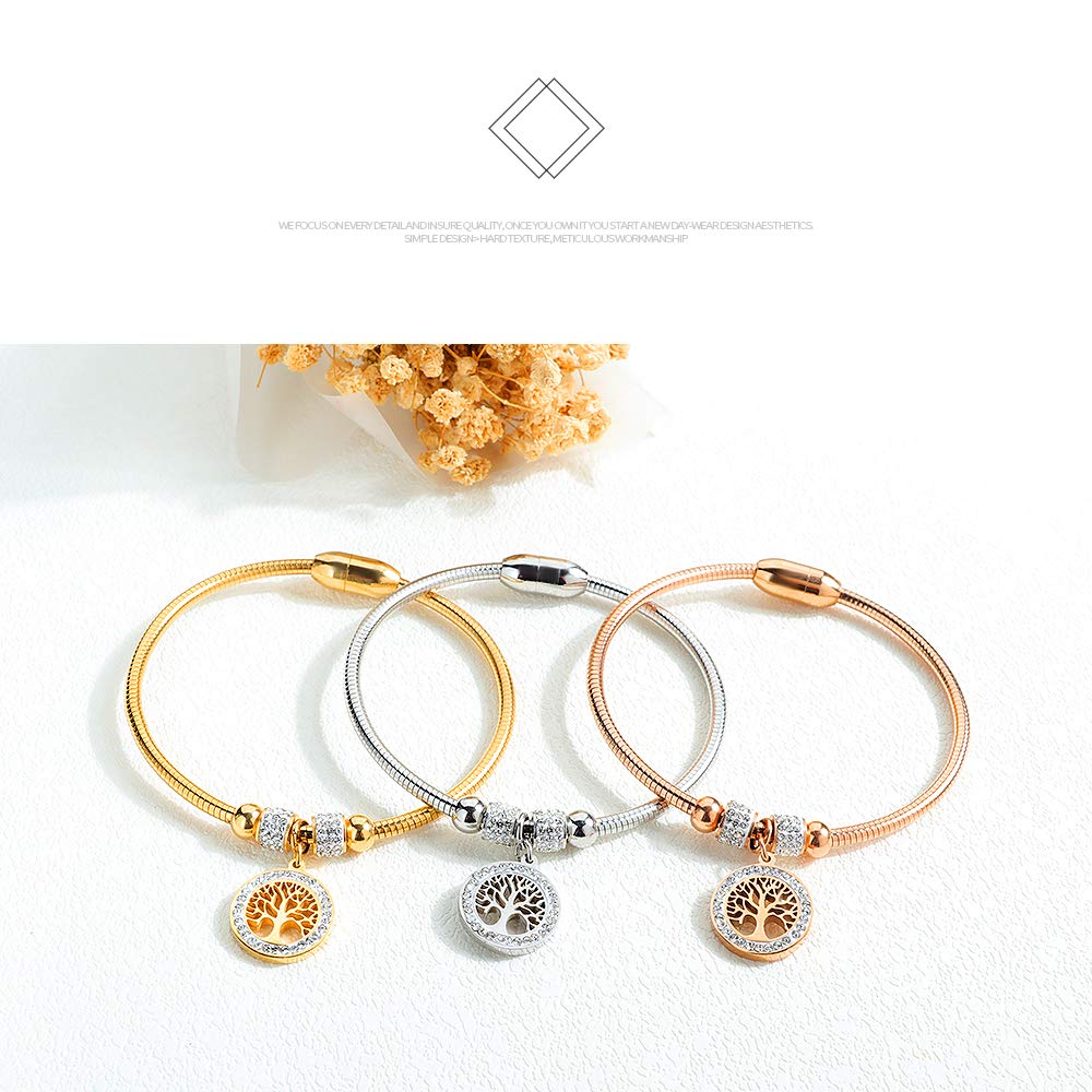 Rockyu ブレスレット レディース 18金メッキ ジルコニア 生命の樹 磁石型バングル 純チタン アレルギー対応