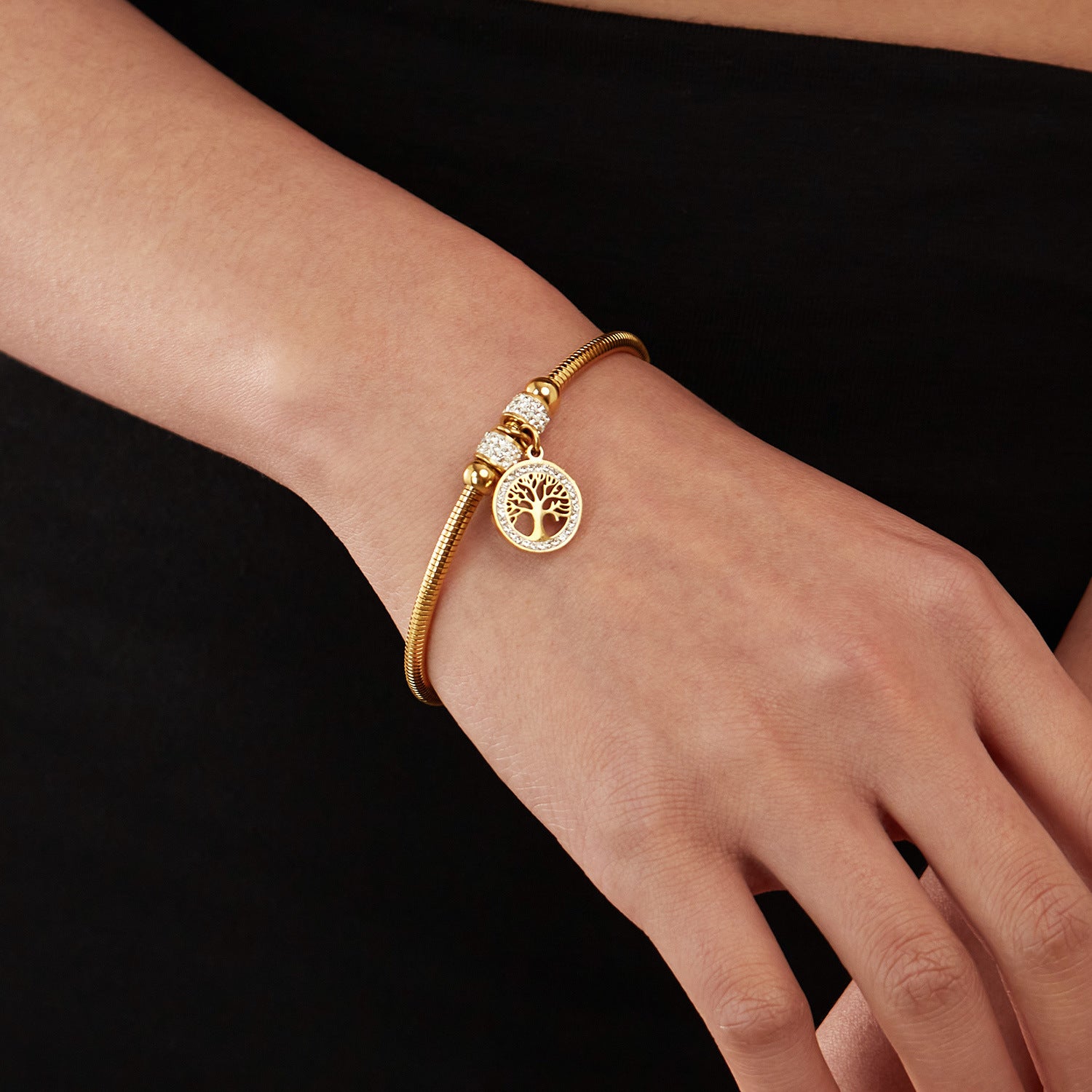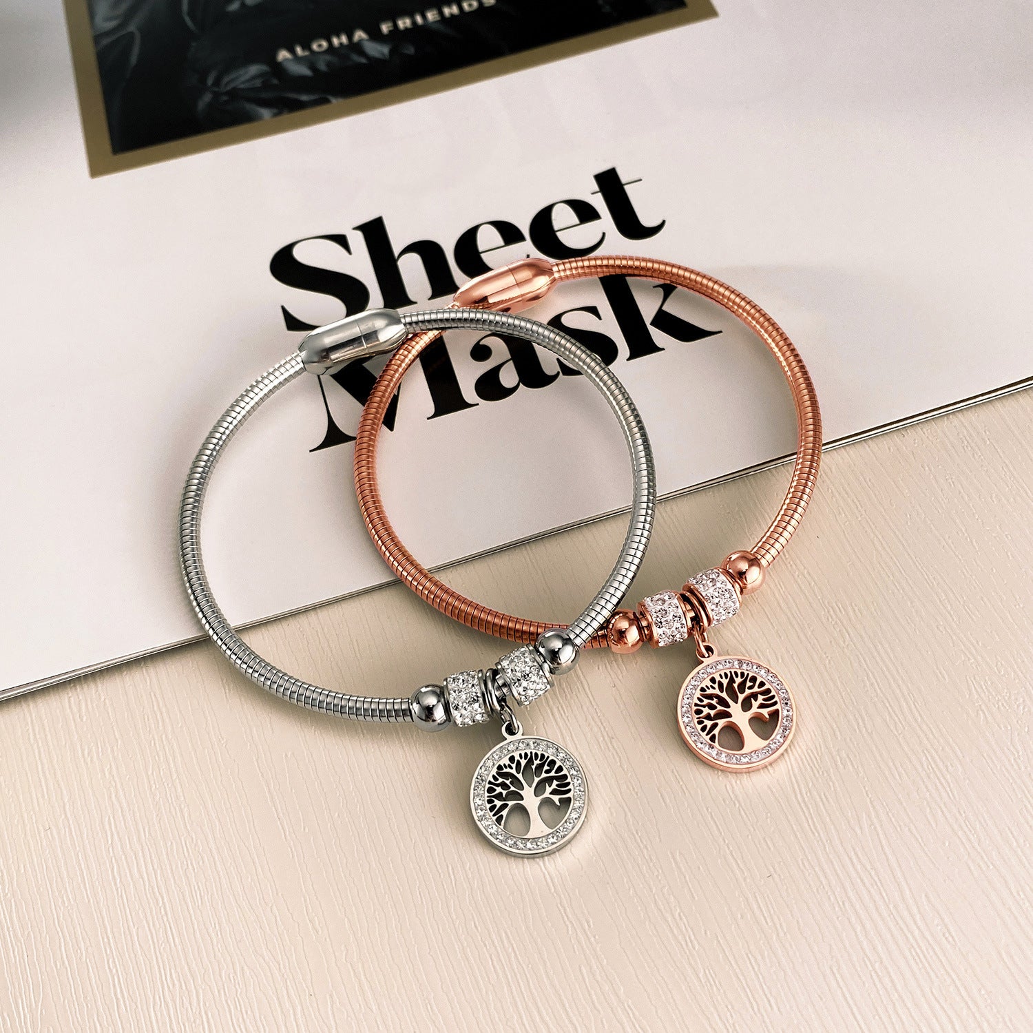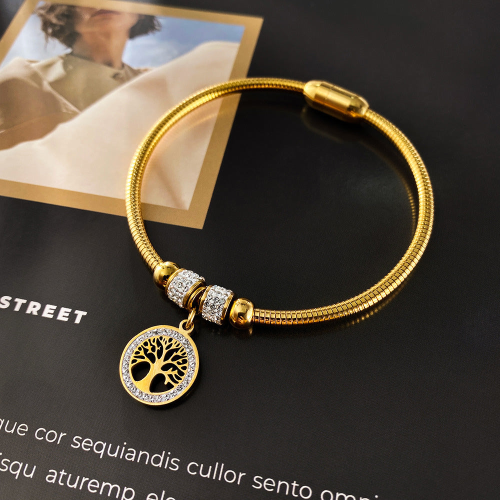 Rockyu ブレスレット レディース 18金メッキ ジルコニア 生命の樹 磁石型バングル 純チタン アレルギー対応