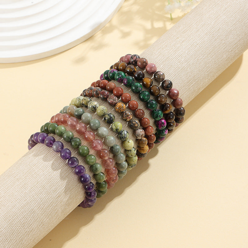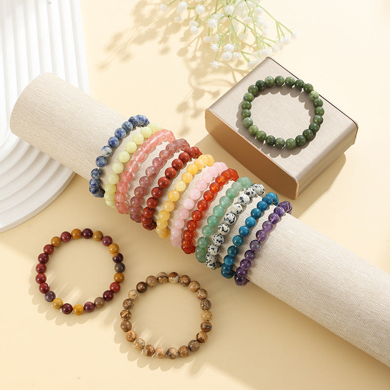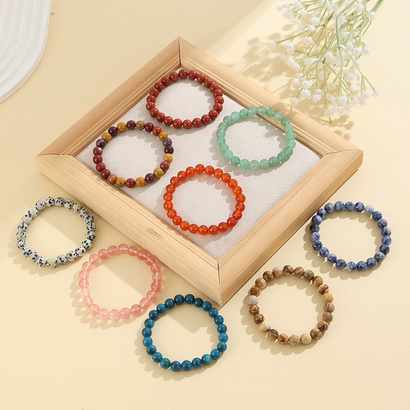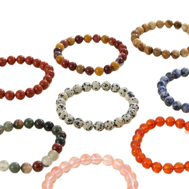 Rockyu が贈る、カラフルな天然石を使用したレディースビーズブレスレット。瑪瑙やオニキスをはじめとするさまざまなストーンを組み合わせ、ひとつひとつ異なる風合いと美しさを楽しめるアイテムです。丸みを帯びたビーズが連なり、シンプルでありながら華やかさとアンティーク風の趣を兼ね備えたデザインに仕上げました。