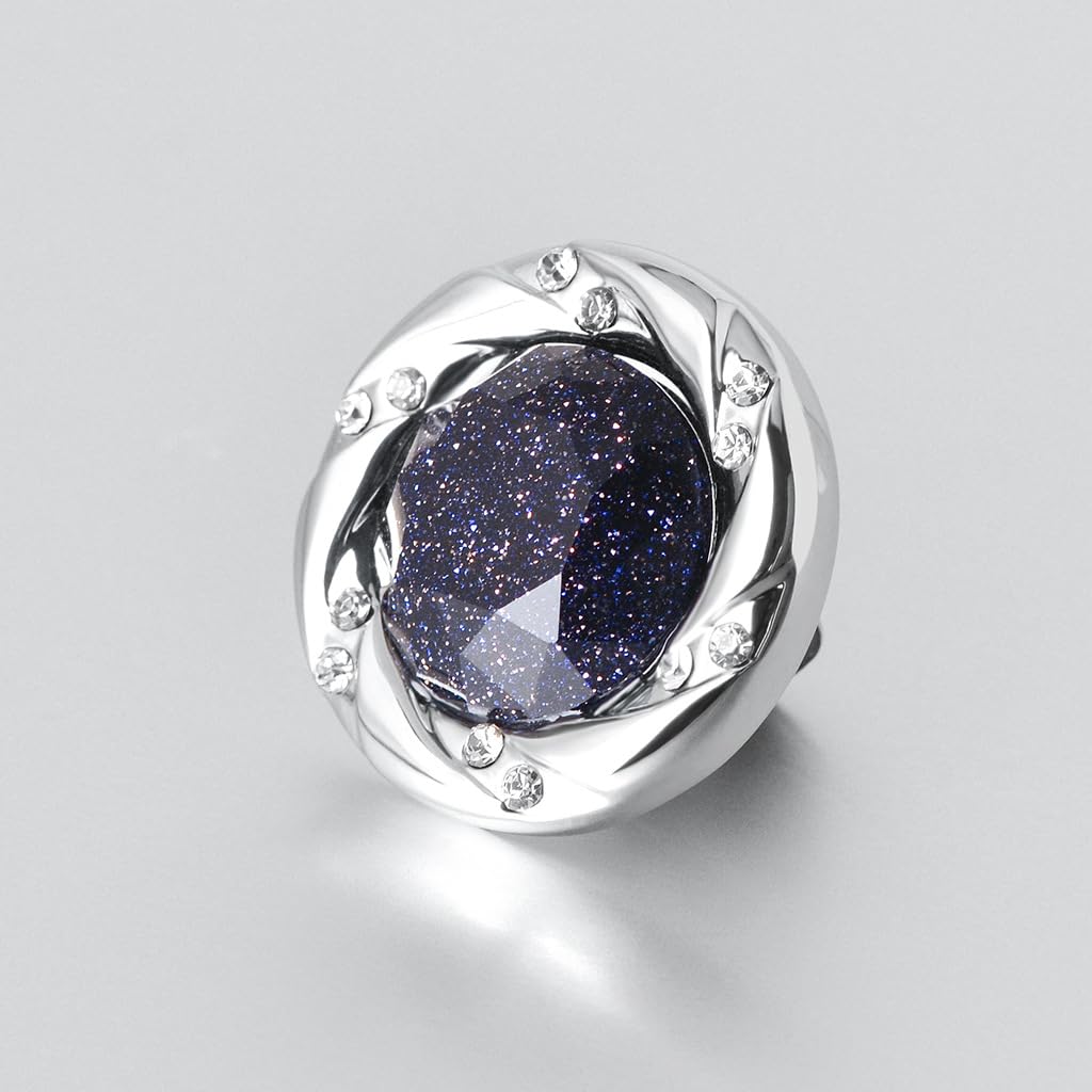 Rockyu が提案するブルーサンドストーンのラウンドブローチは、フォーマルスタイルを格上げする大人のスーツアクセサリー。深い夜空のように輝くブルーサンドストーンを中央に配し、周囲をステンレスでしっかりと囲んだ高級感あるデザインが魅力です。
