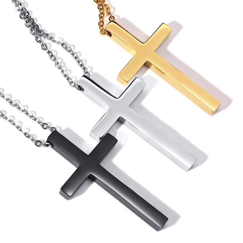 高光沢ステンレススチールにチタン仕上げを施し、金属アレルギーにも安心の構造。ゴールド・シルバー・ブラックの3カラー展開で、どれも存在感抜群。クロスサイズは縦54mm×横30mm、重量は18gとしっかりとしたボリューム感が魅力。