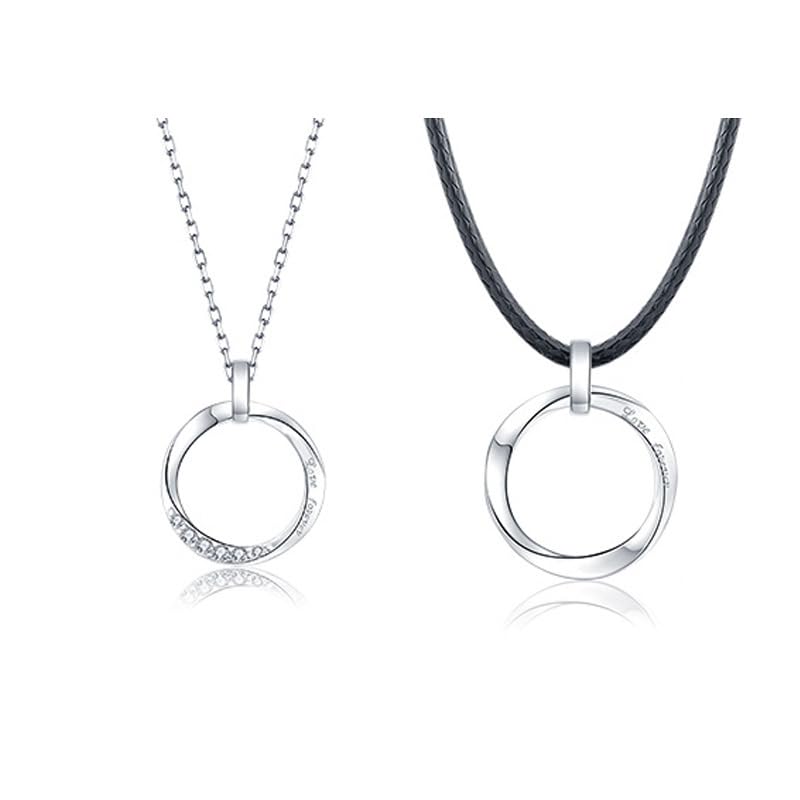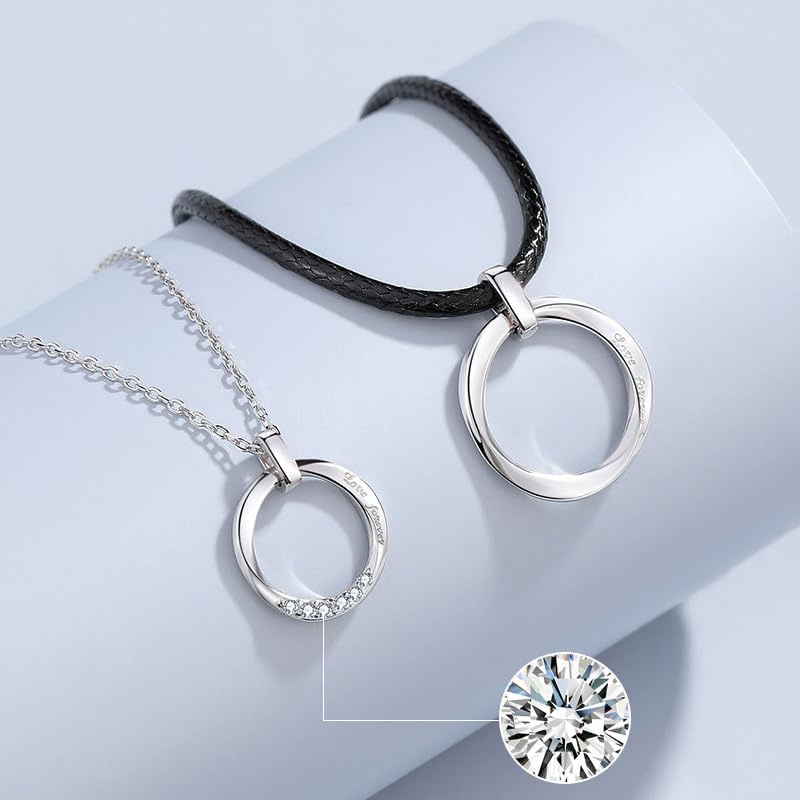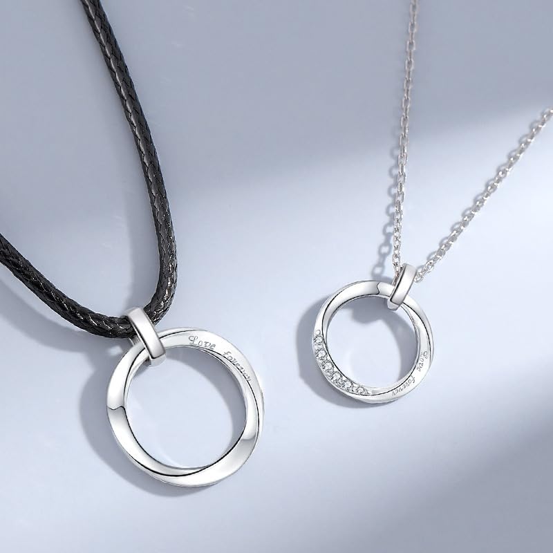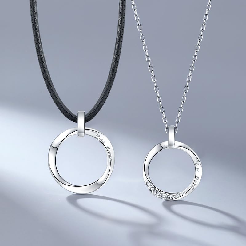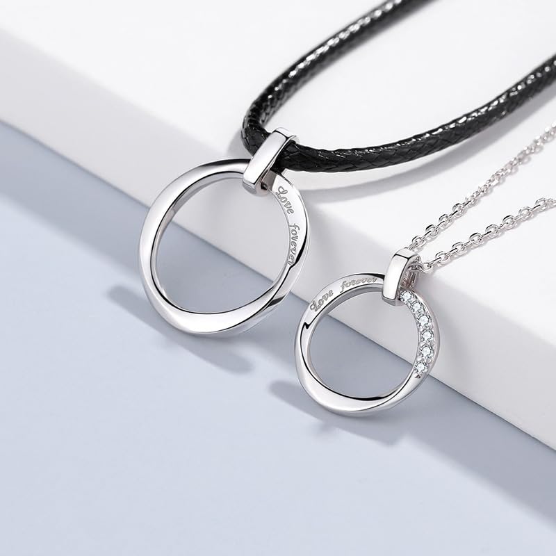 Rockyuが贈る、大人のための上質なペアネックレス。シンプルなリングモチーフに「Love Forever」の刻印が施され、飾りすぎない中にも深いメッセージ性を宿したデザインです。レディースは華奢なチェーンとジルコニアの輝きを添えた上品な仕上がり、メンズはシックな黒の革紐で、力強さとスマートさを両立。