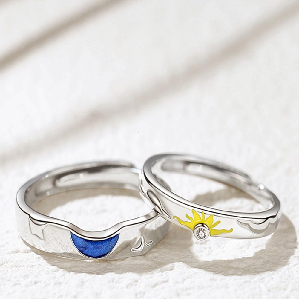 Rockyu 太陽と月のペアリング シルバー925 日月デザイン 指輪 調整可能