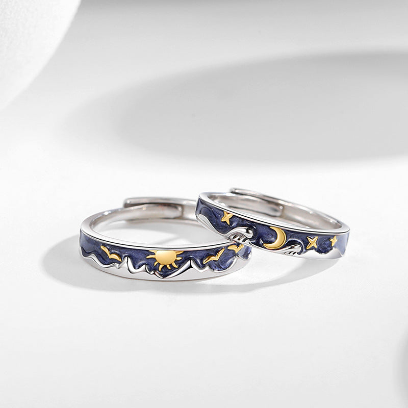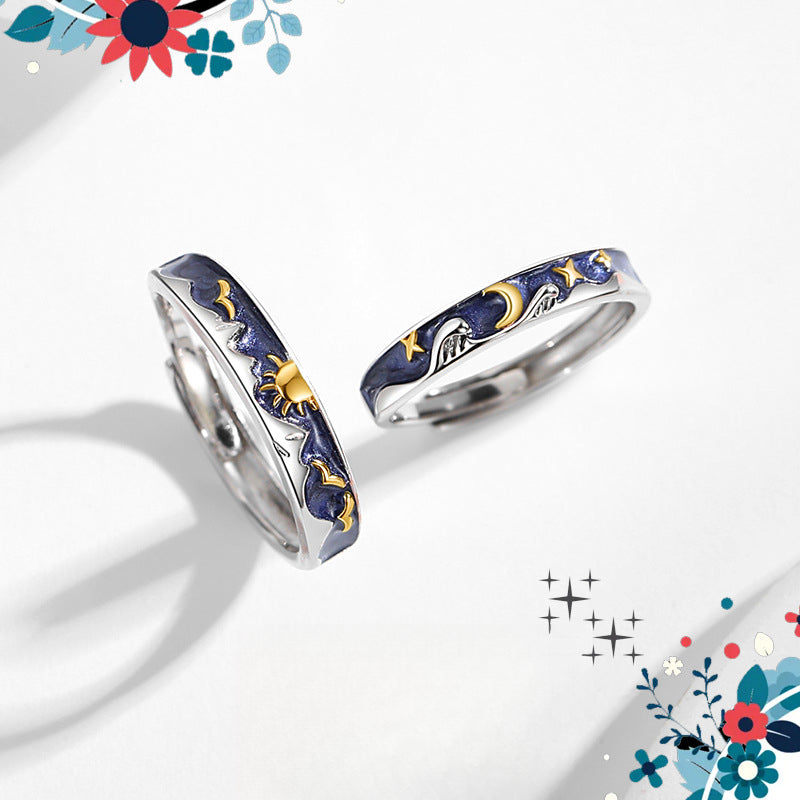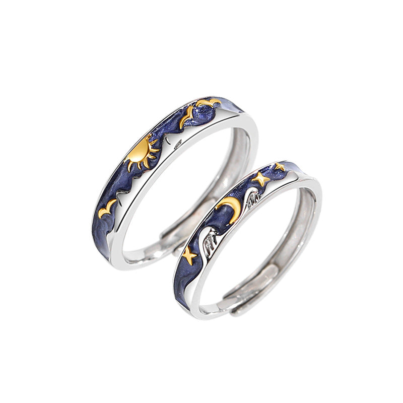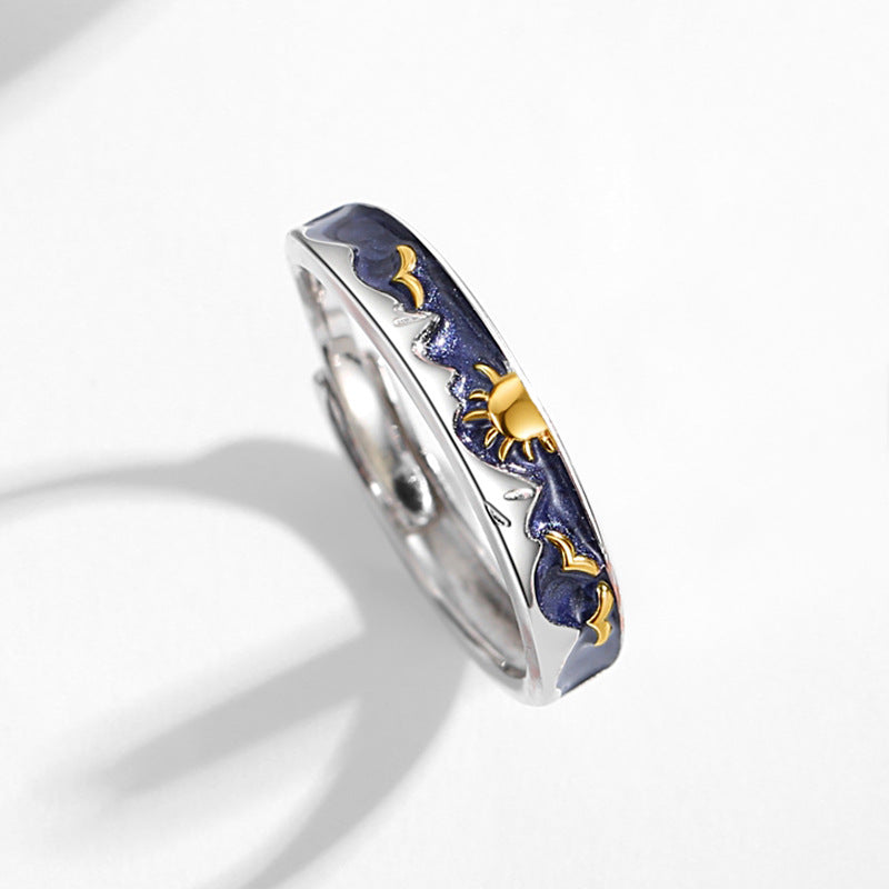 Rockyu フリーサイズリング 藍色の空に太陽と月が輝く幻想デザイン