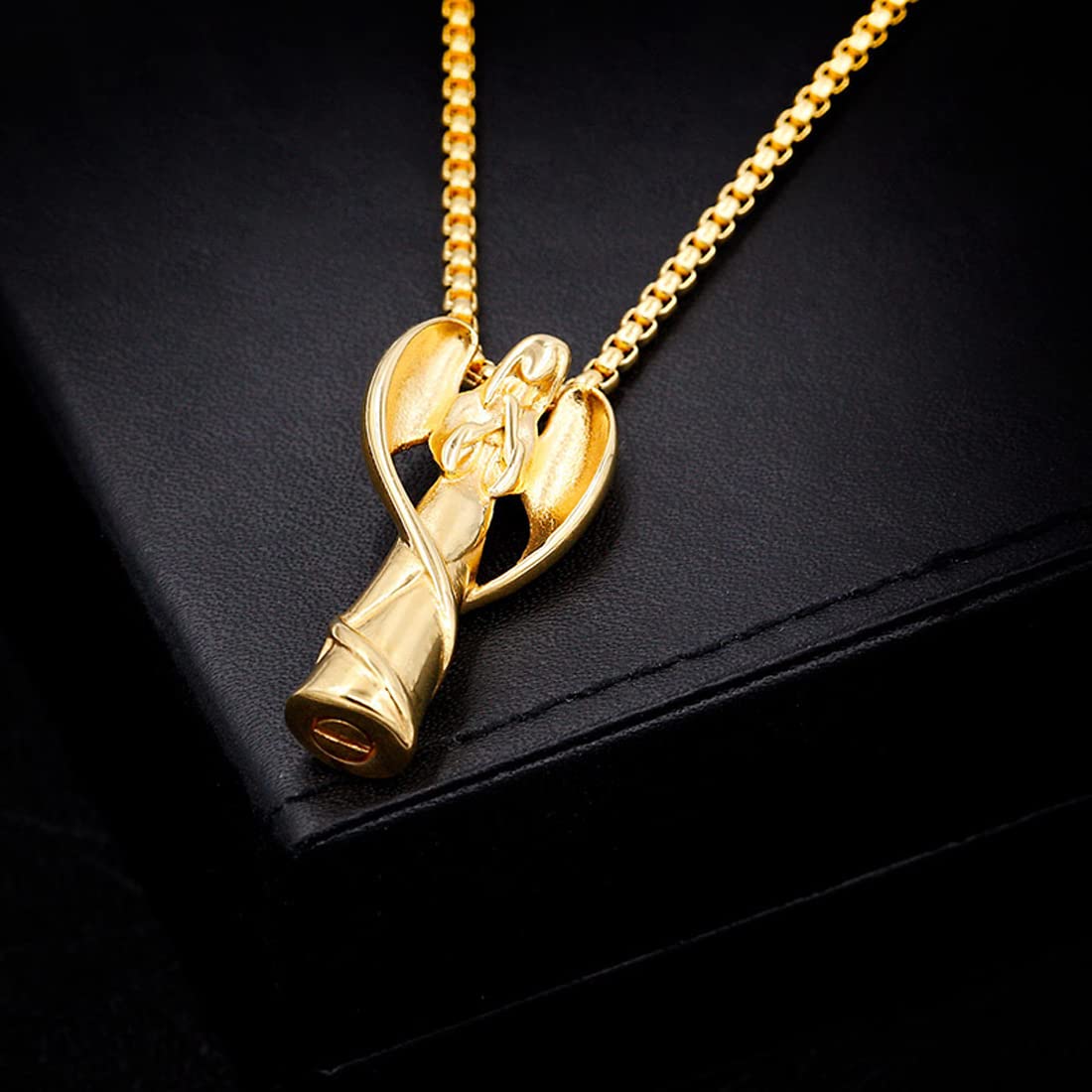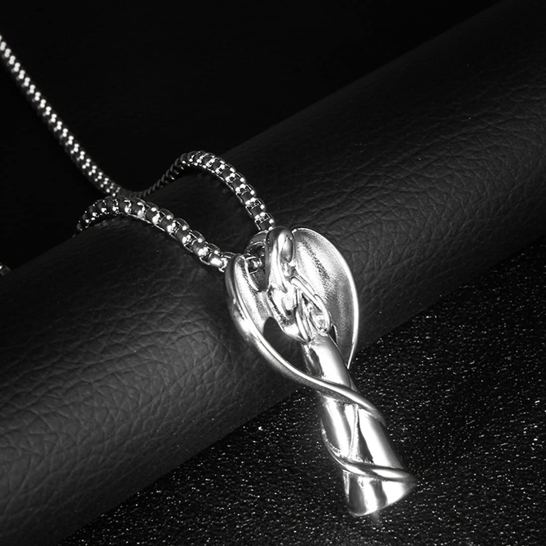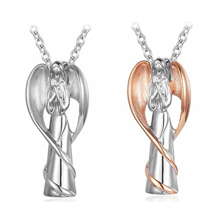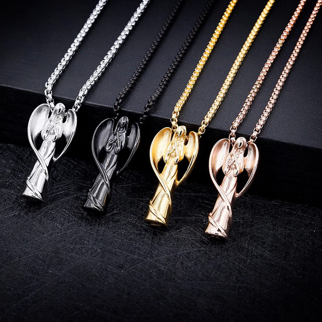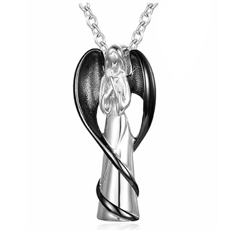 Rockyu のメモリアルネックレスは、天使が祈る姿をモチーフにした優美なデザインが特徴。羽根を大きく広げたシルエットは力強さとやさしさを表現し、胸元に神秘的な輝きを添えます。カラーはシルバーを基調に、ブラック・ゴールド・ローズゴールドの差し色が選べ、幅広いスタイルに合わせられるユニセックス仕様です。