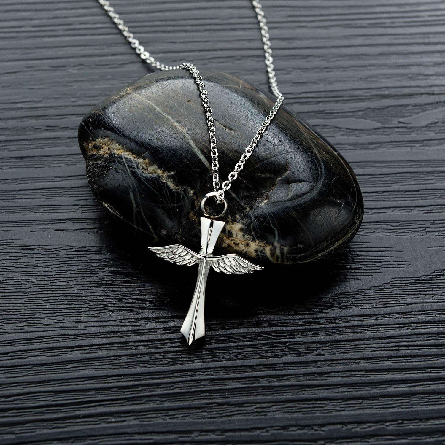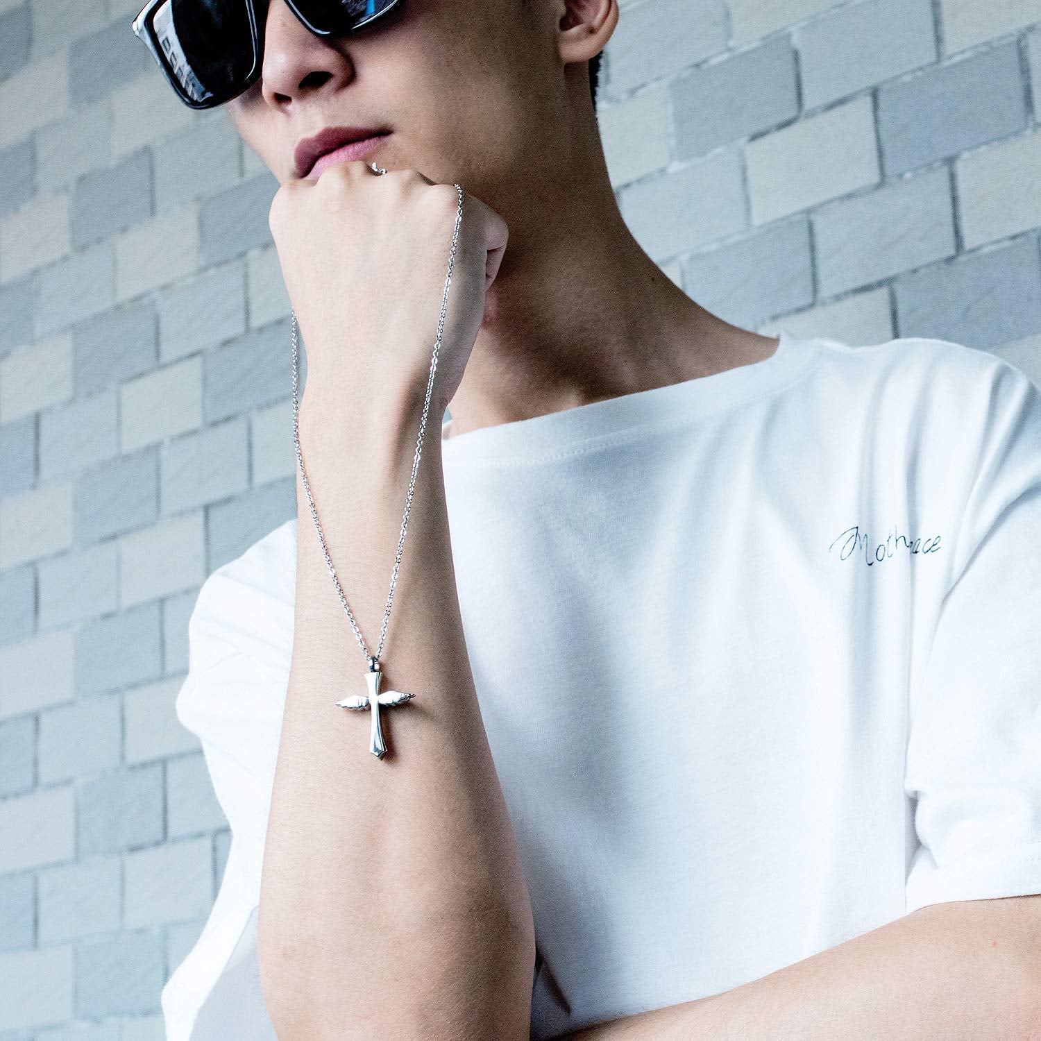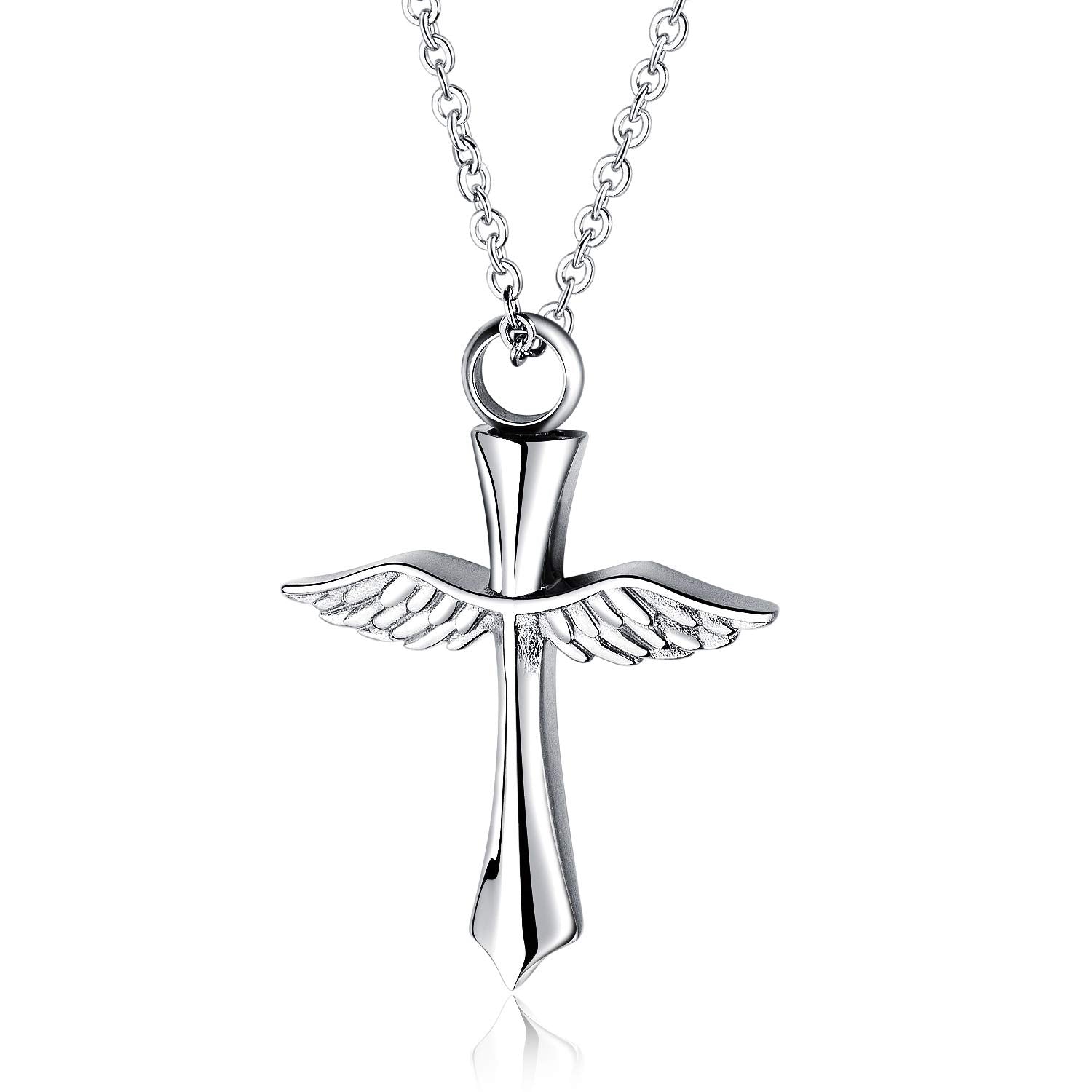 Rockyu 天使の翼 クロスネックレス メンズ レディース|ステンレス製 メモリアル 遺骨ペンダント