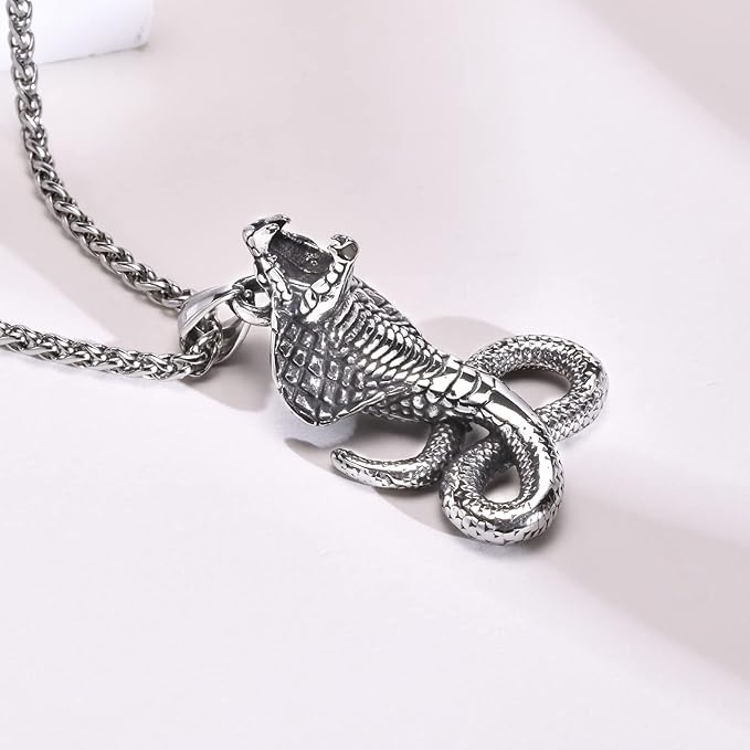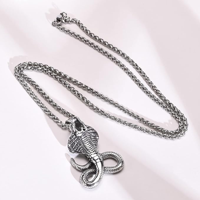 Rockyuのコブラペンダントネックレスは、精密なディテールで表現された蛇モチーフが特徴的なステンレス製アクセサリー。42.5mmの迫力あるサイズ感で、ロックやストリート系ファッションにも映えます。金属アレルギーに配慮した素材を使用し、普段使いからイベントまで幅広く活躍。男性への誕生日や記念日のギフトにも最適です。