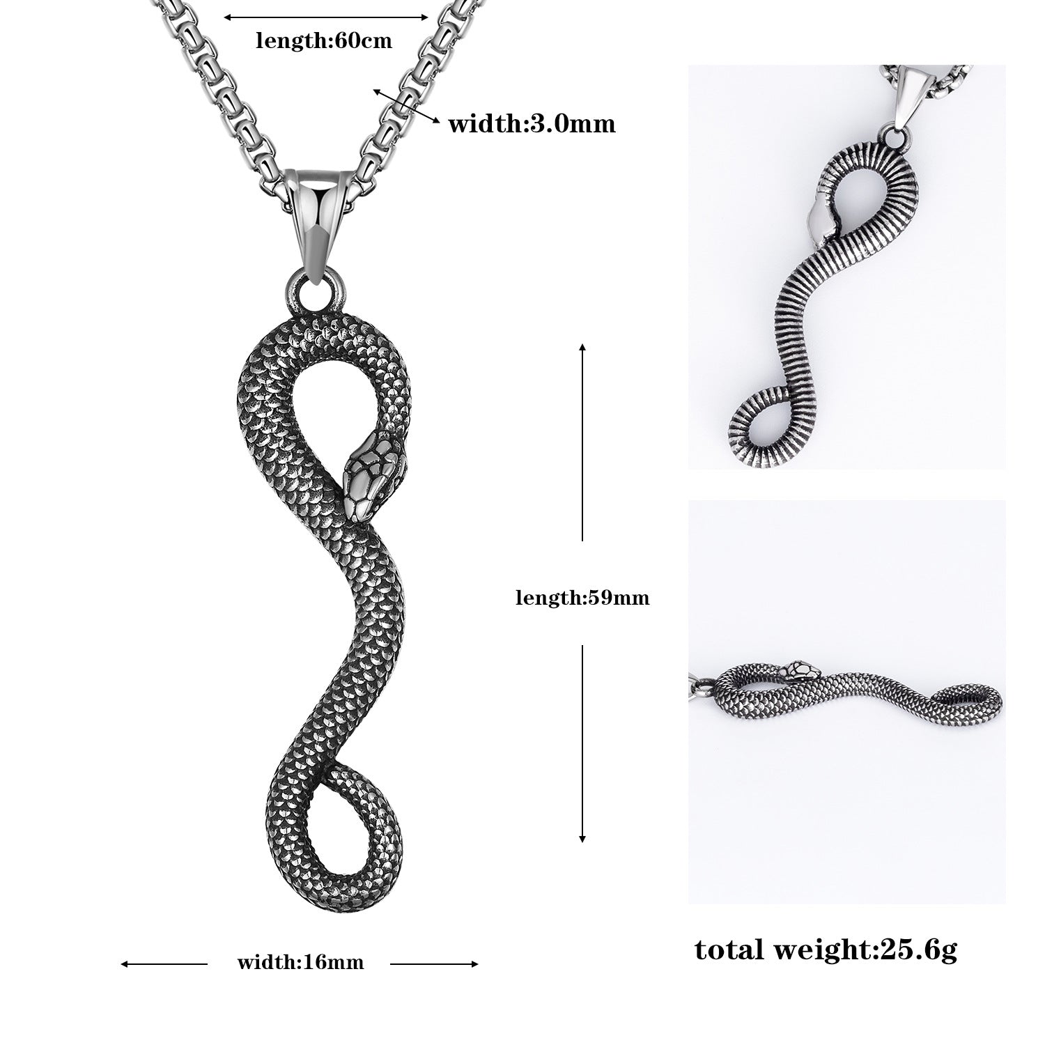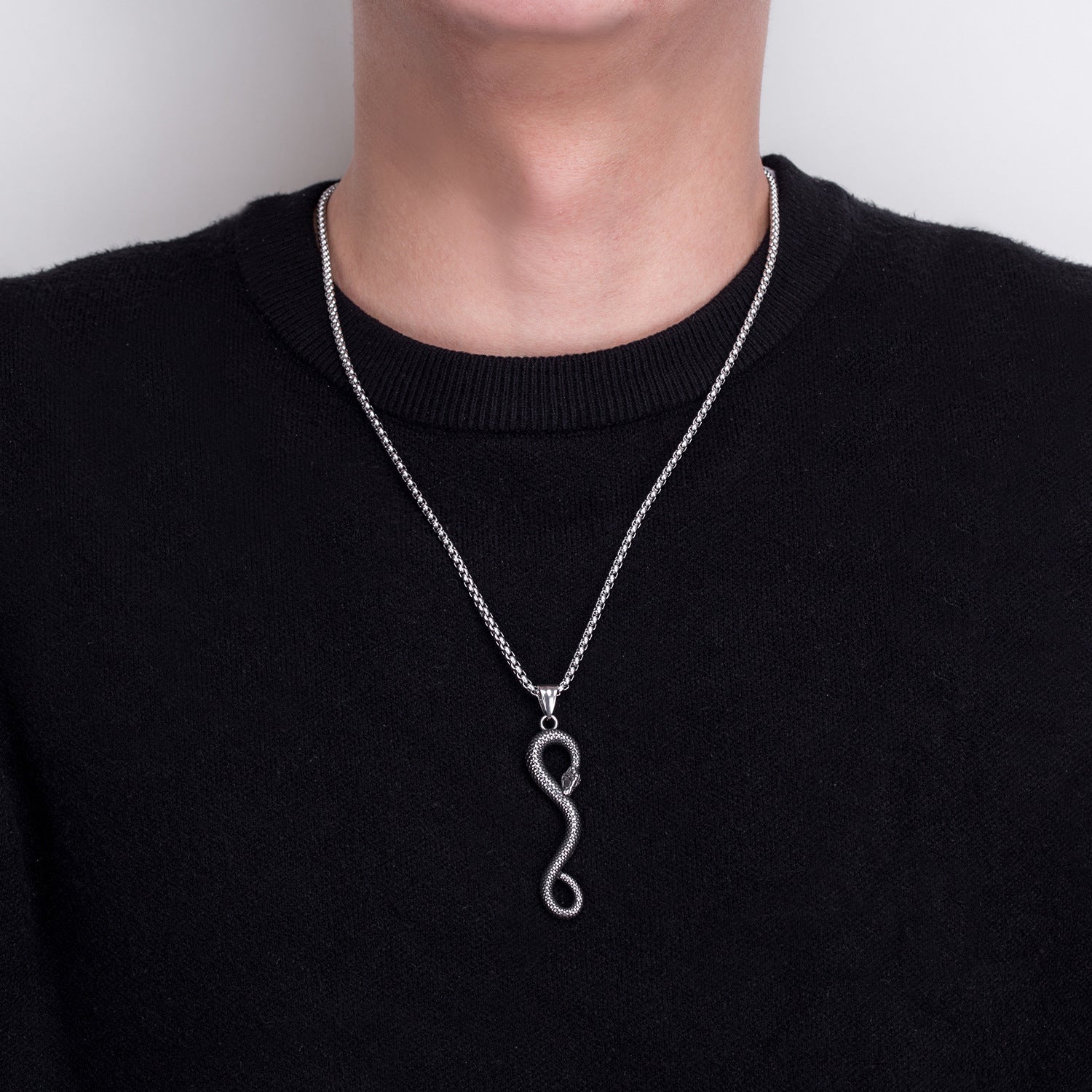 Rockyuのスネークペンダントネックレスは、リアルな鱗模様としなやかな曲線美が魅力のステンレス製アクセサリー。長さ59mmの迫力あるデザインで、ロックやストリート系スタイルにも相性抜群。金属アレルギー対応素材を採用し、普段使いからイベントまで活躍。男性への誕生日や記念日のプレゼントにもおすすめです。