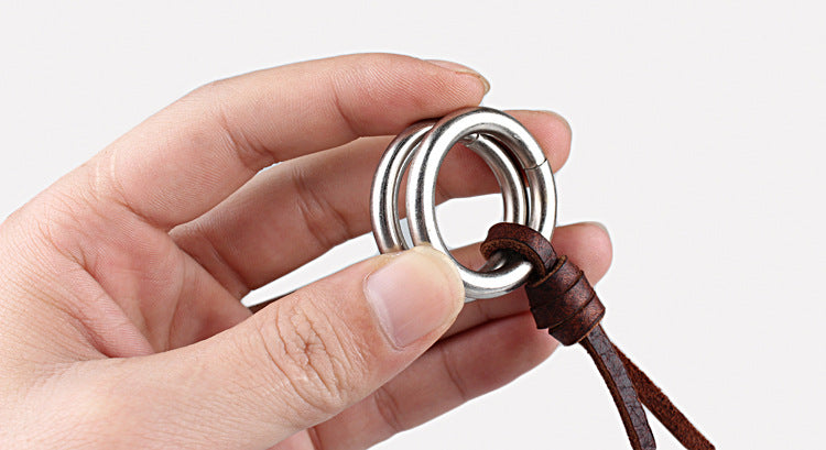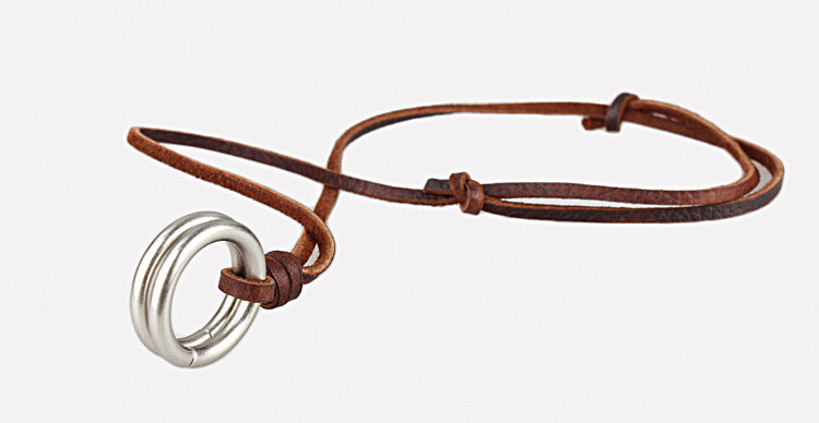 Rockyuのリングペンダントネックレスは、ナチュラルな牛革紐と無骨なステンレスリングのコントラストが魅力の一品。60cmのロング仕様で、Tシャツやセーターの上にサラッと合わせるだけで、スタイリングに「味」が生まれます。