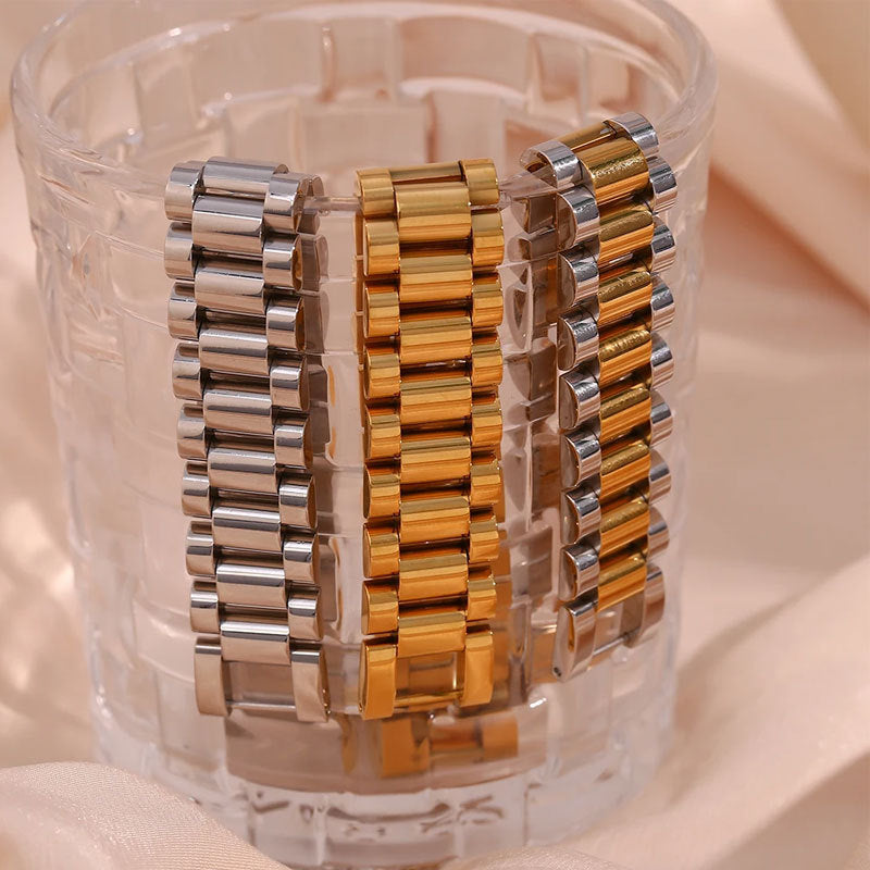 長さは21cmとしっかりとしたサイズ感で、手首を包み込むようにフィット。カラーはシルバー、ゴールド、ブラック、ローズゴールド、ツートンなど豊富に展開。コーデに合わせて選ぶもよし、気分で付け替えるのもアリ。まさに“大人の贅沢”を楽しむ一本。