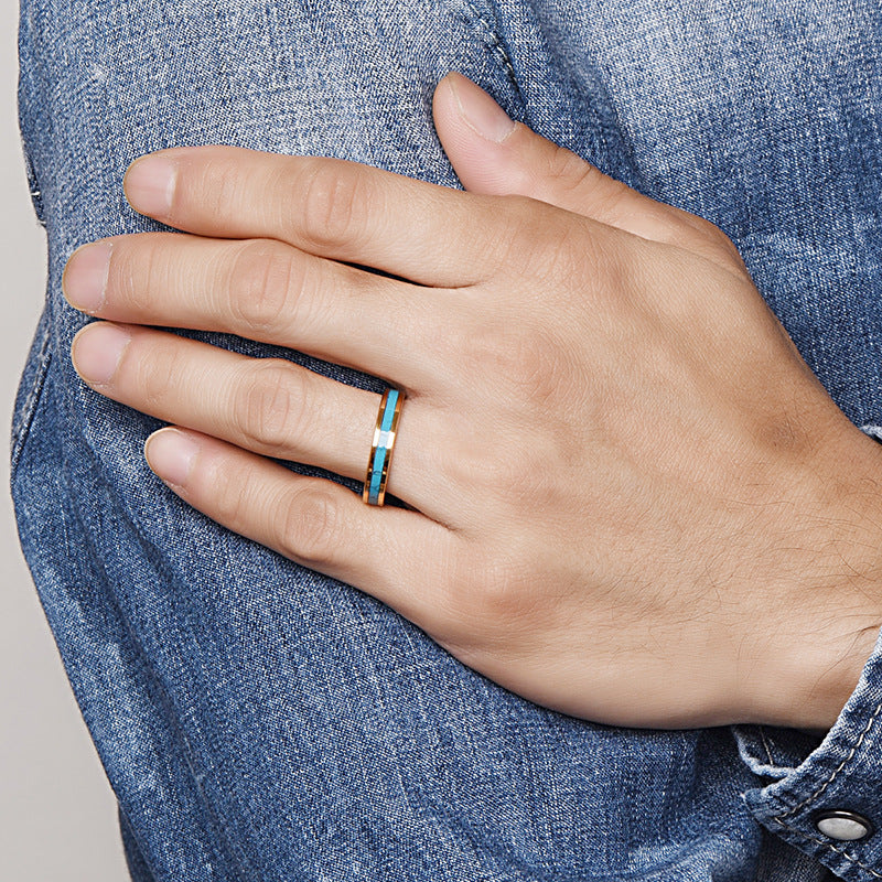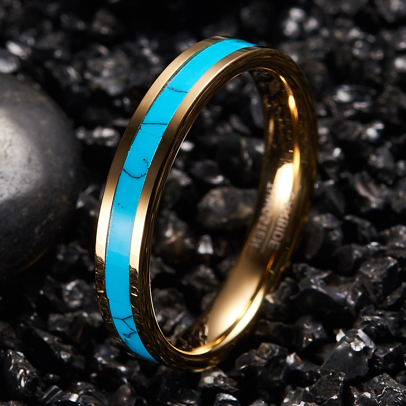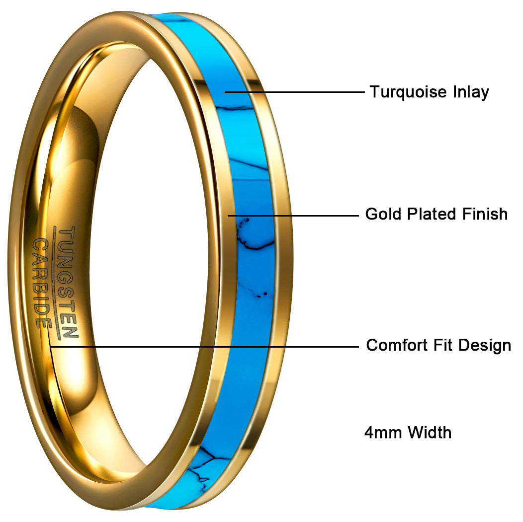 Rockyu タングステン ゴールド×ターコイズインレイリング 4mm幅 メンズ レディース ユニセックス