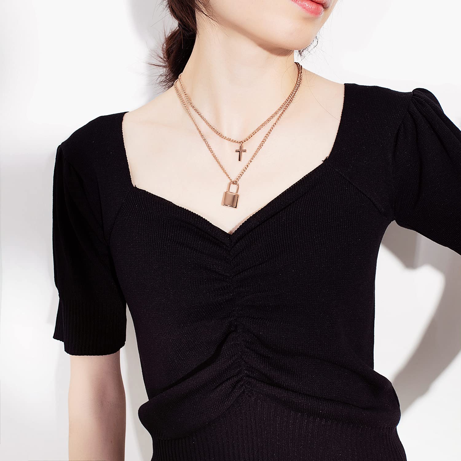 Rockyu レディース ネックレス 十字架 南京錠 ペンダント ピンクゴールド 18K チタン 2連チェーン