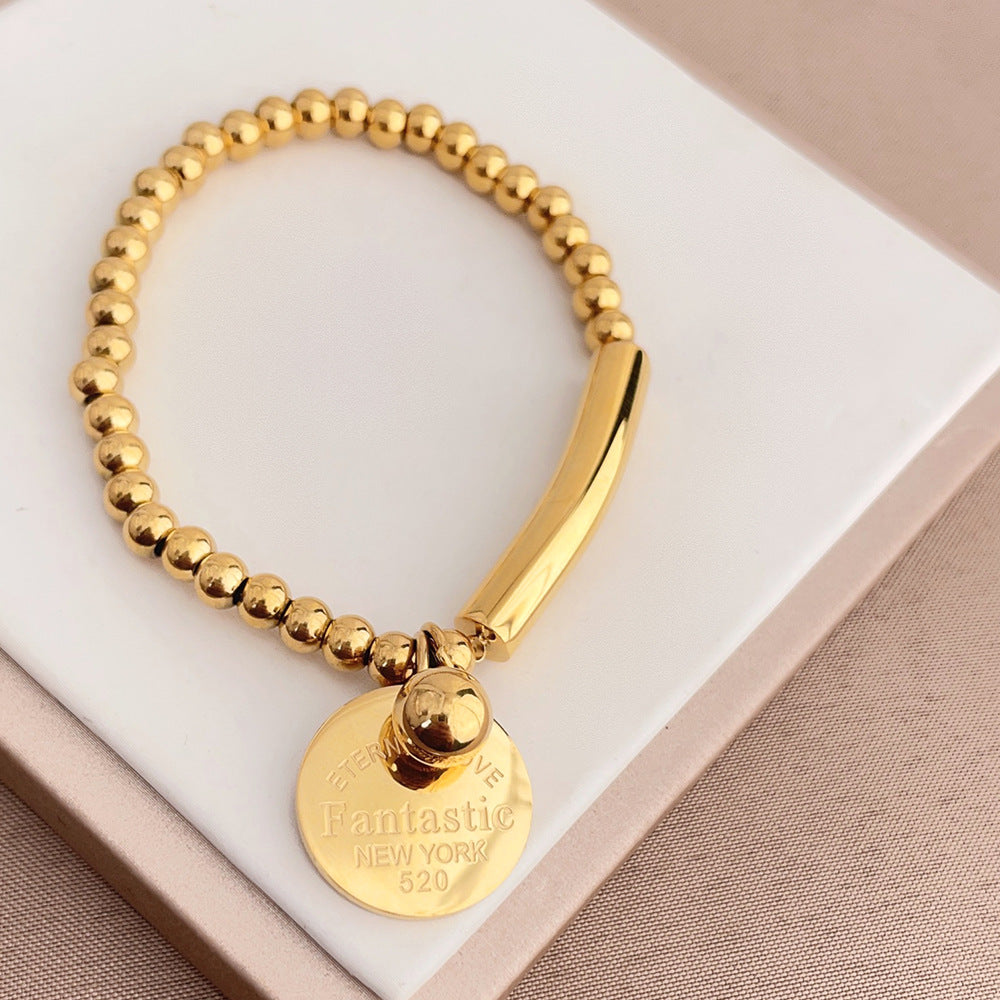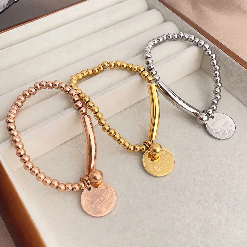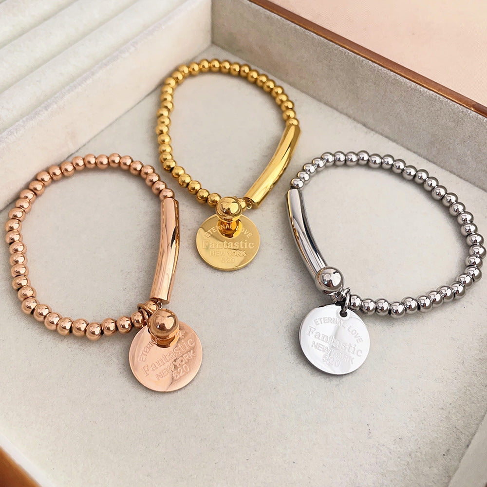 Rockyu レディースビーズブレスレット ステンレス製 刻印チャーム付き ニューヨークスタイル ファッションアクセサリー