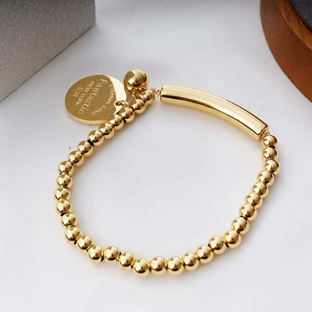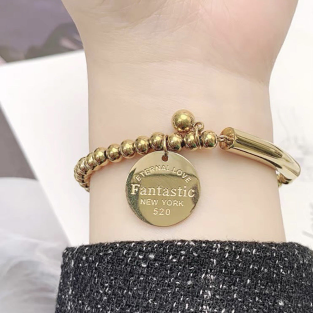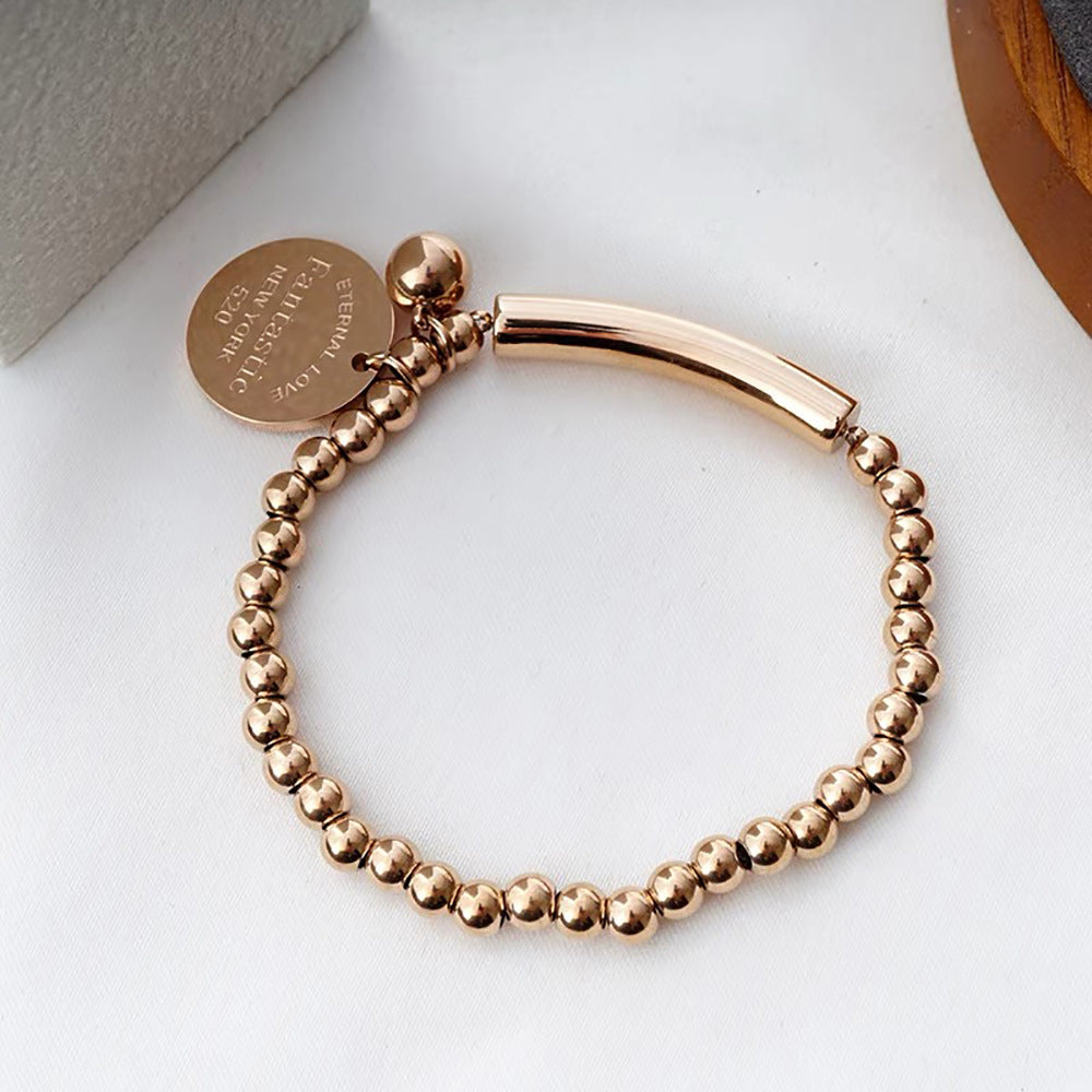 Rockyuが提案するレディースビーズブレスレットは、ステンレス製の上質な光沢と、存在感のある刻印チャームが魅力。丸みのあるビーズと緩やかなカーブを描くメタルバーの組み合わせが、手首をしなやかに彩ります。ゴールド、シルバー、ローズゴールドの3色展開で、カジュアルからフォーマルまで幅広く対応。軽量で着け心地も快適なため、日常使いはもちろん特別な日にも活躍します。刻印チャームにはニューヨークテイストを感じさせる文字デザインを採用し、シンプルながらも洗練された印象を与えます。自分用にも、大切な人へのギフトにもぴったりのアイテムです。