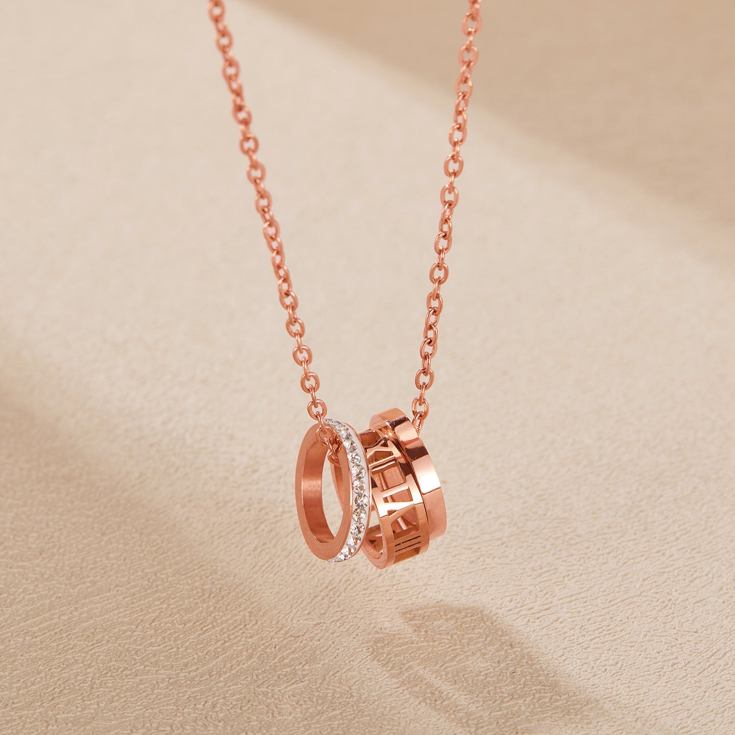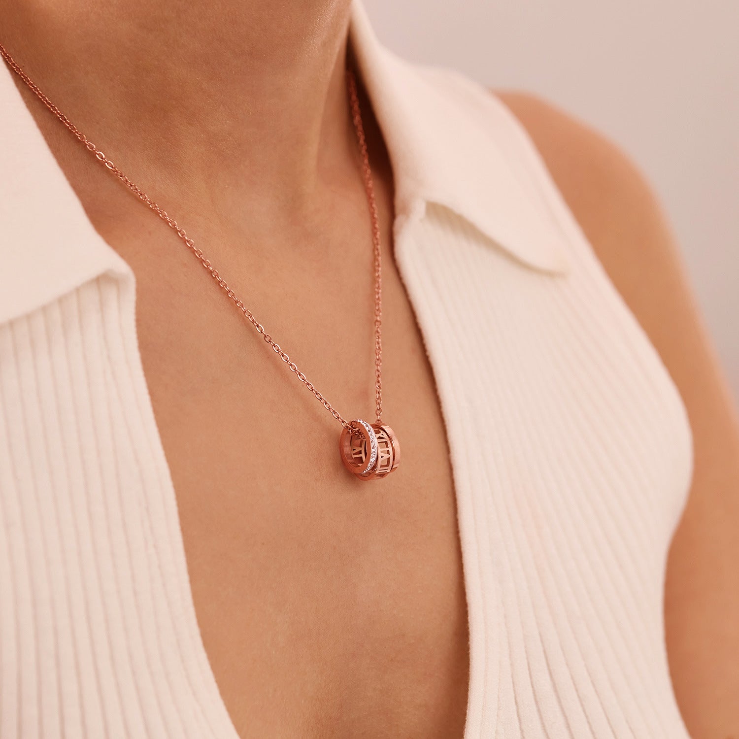 Rockyuから、控えめな輝きと洗練されたデザインが胸元を彩るリングネックレスが登場。ローマ数字を刻んだミニマルなサークルに、繊細なキュービックジルコニアがきらめくダブルリング仕様。ピンクゴールドの温もりあるカラーが、大人の可愛らしさを演出します。