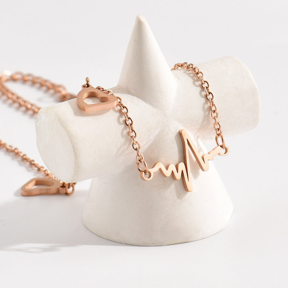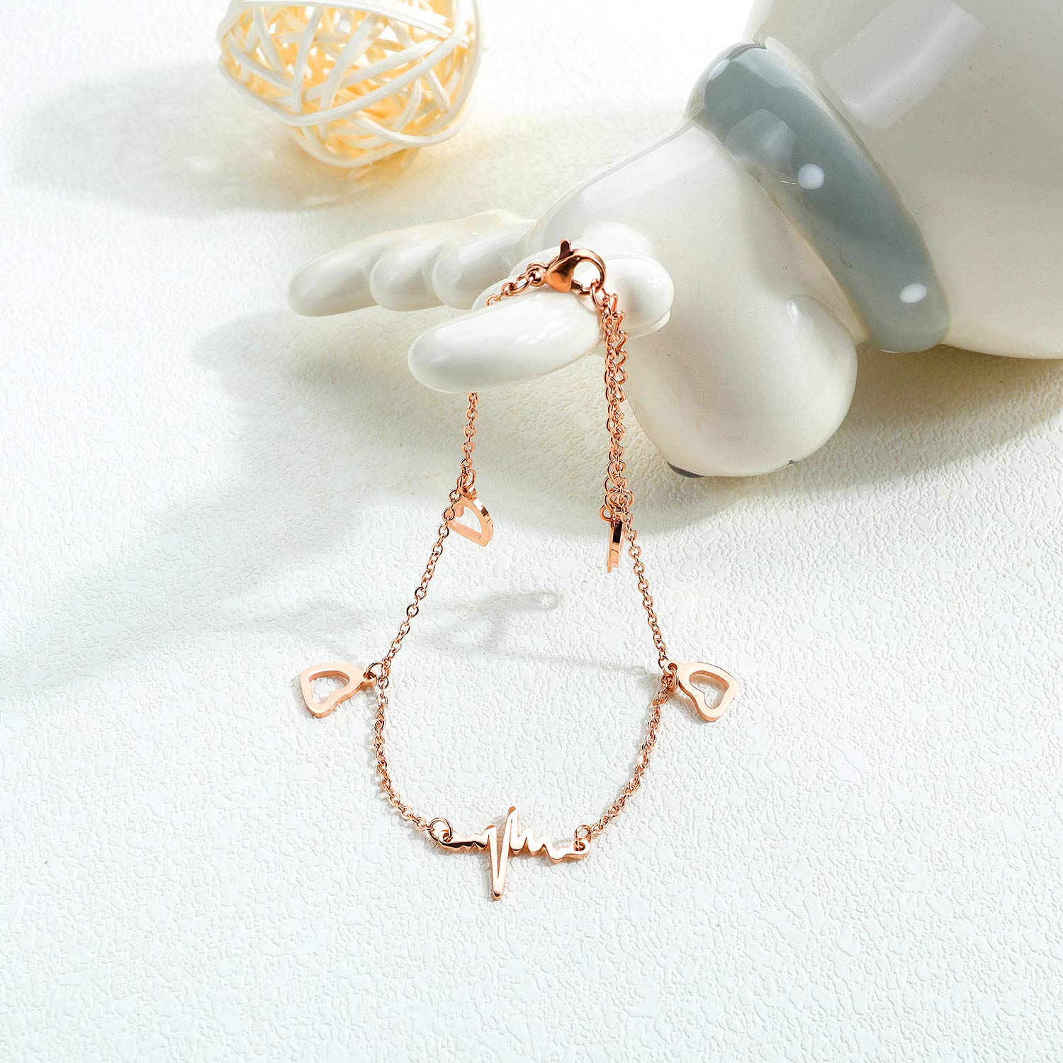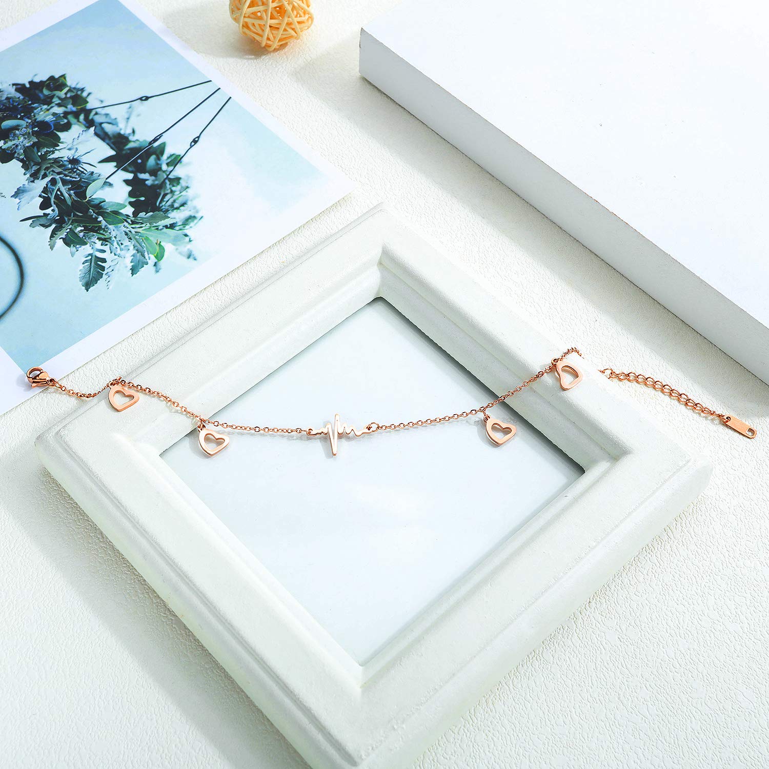 Rockyuのアンクレットは、心電図モチーフとハートが組み合わさった遊び心あふれるデザイン。ピンクゴールドの優しい輝きが、女性らしい華奢さを際立たせ、足元をさりげなく彩ります。