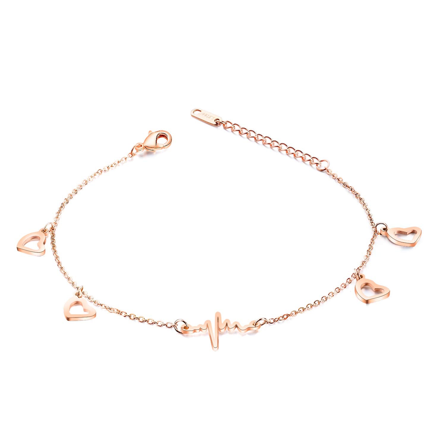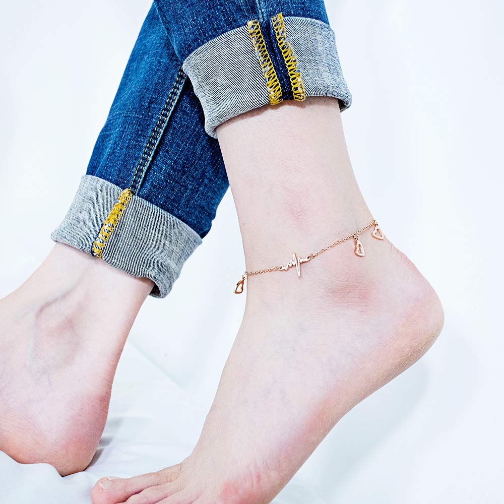 Rockyu アンクレット レディース ピンクゴールド 18K チタン 心電図 ハート 細身チェーン