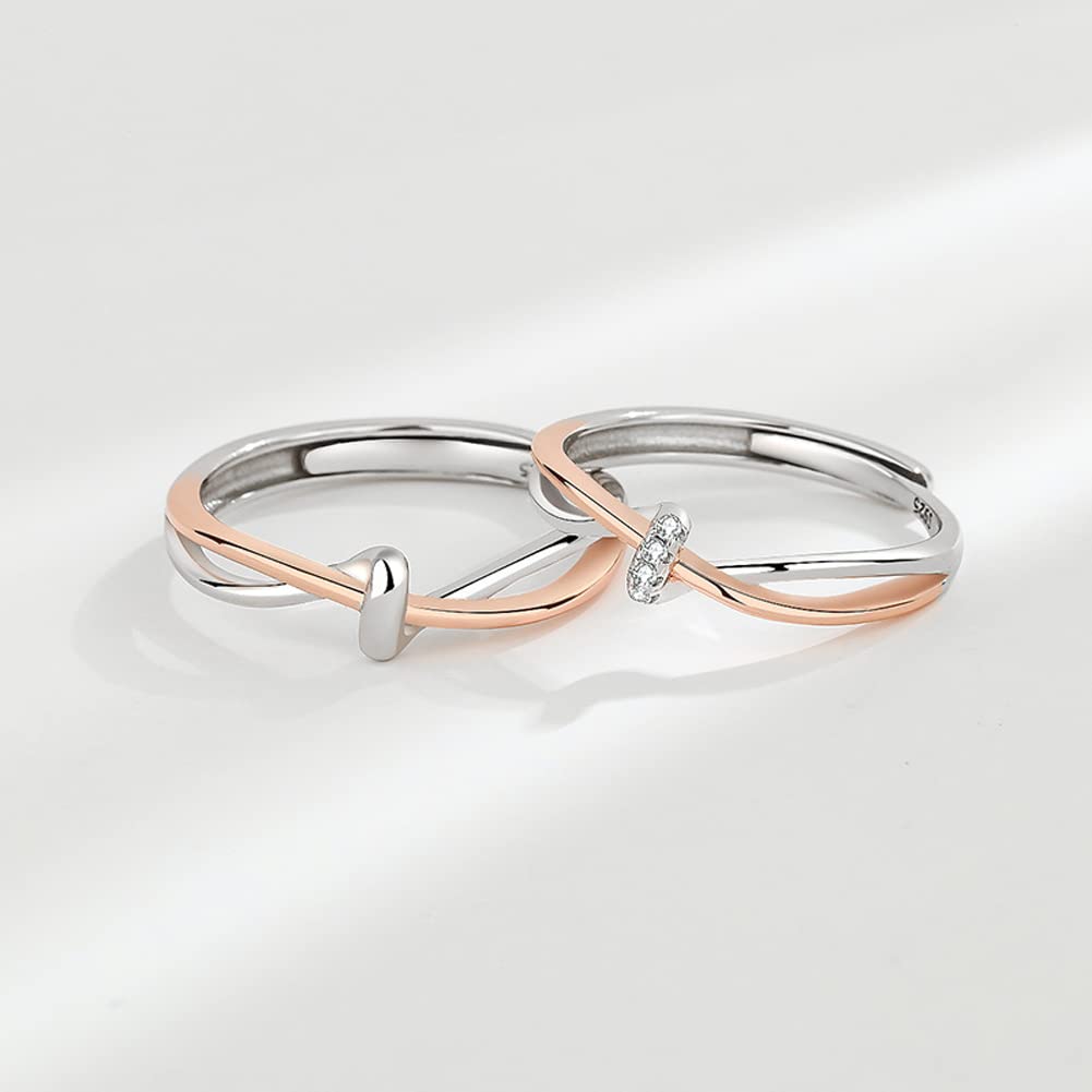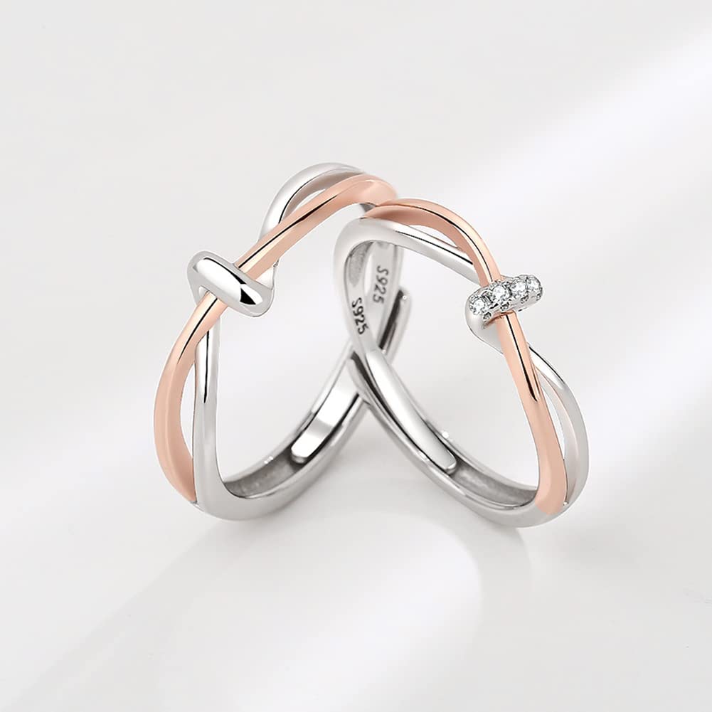 指先でつながる、ふたりの絆。Rockyuの結びペアリングは、ひと目で心ときめく「結び」デザイン。ピンクゴールドとシルバーの優美なクロスラインが、愛と約束のシンボルを織り成します。