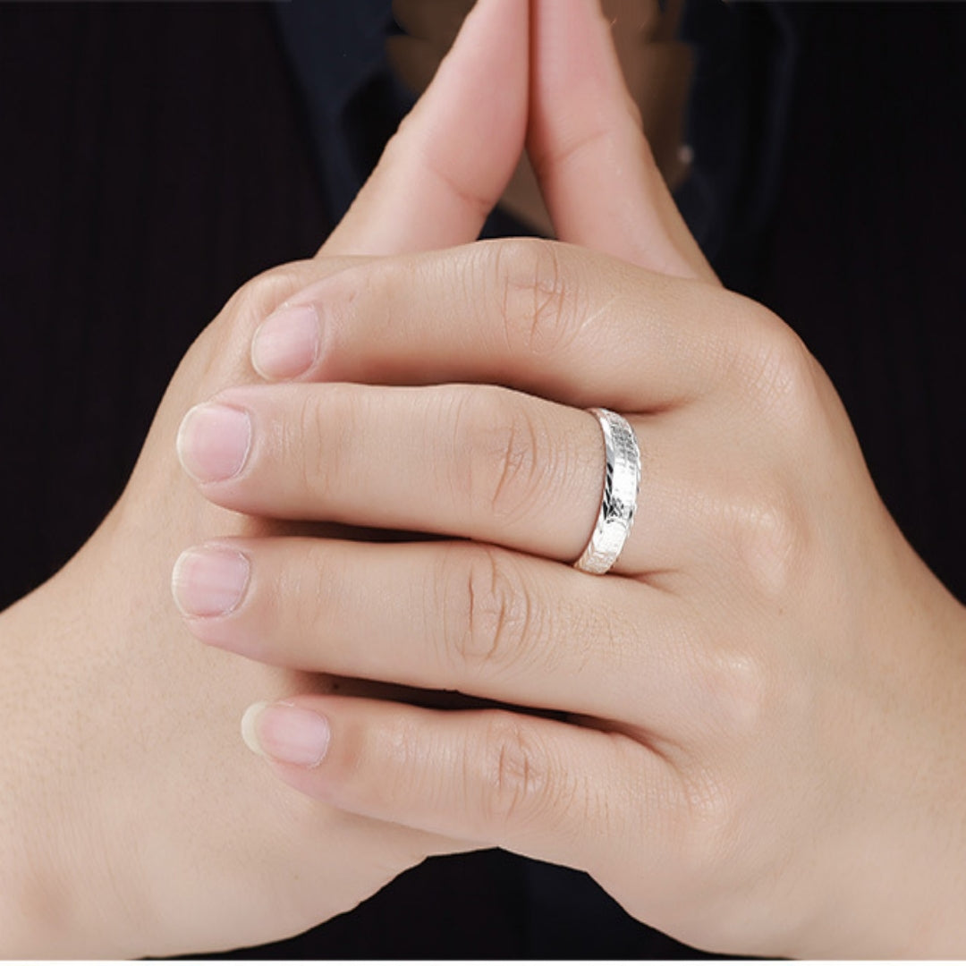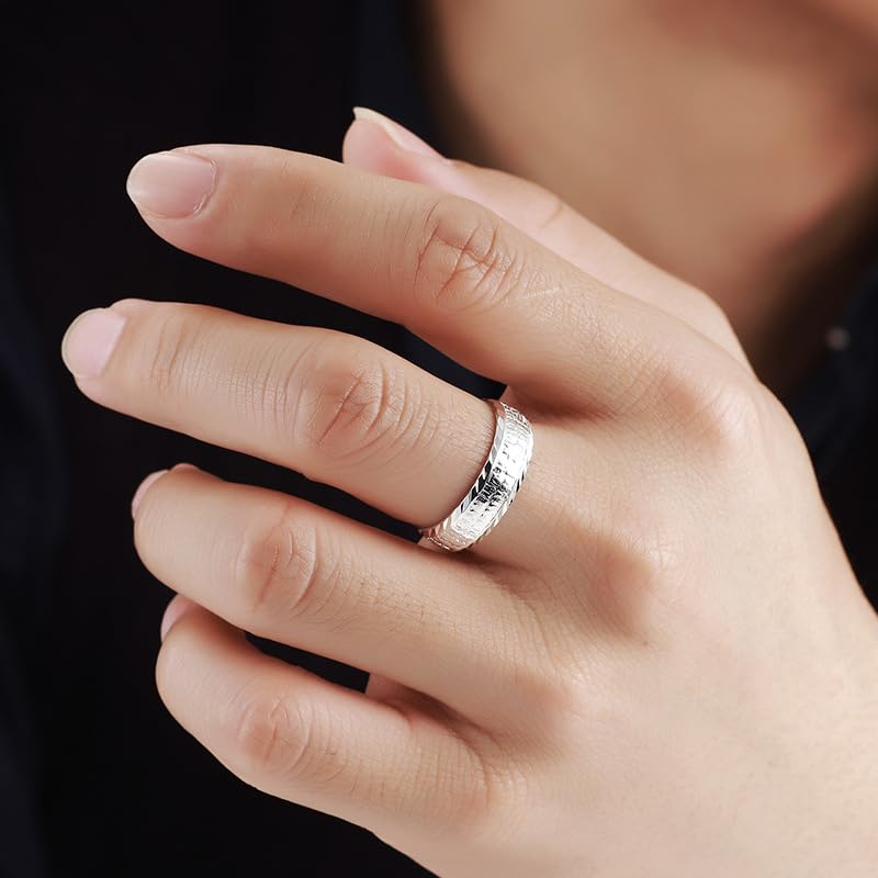 Rockyuの福字刻印メンズリングは、縁起の良さとスタイリッシュさを兼ね備えた一本。重厚感のある純銀999をベースに、福を招く漢字の刻印が繊細に施され、指に身に着けることでポジティブなエネルギーを呼び込むかも!?