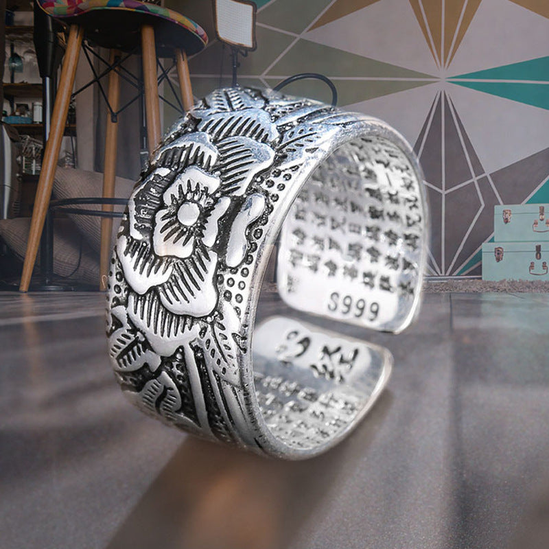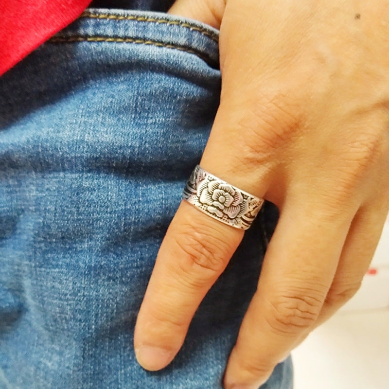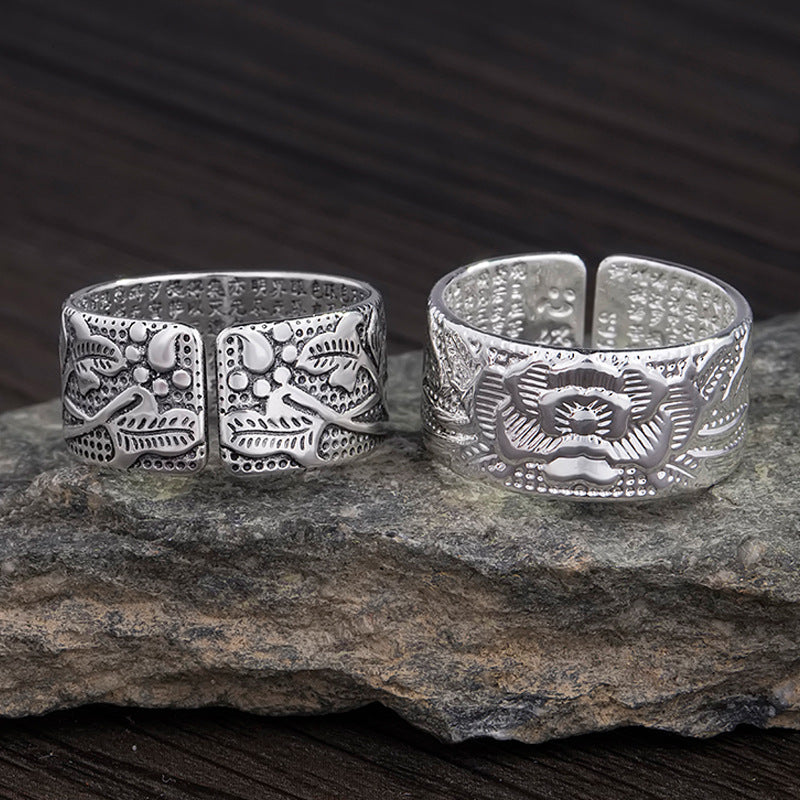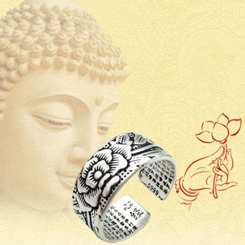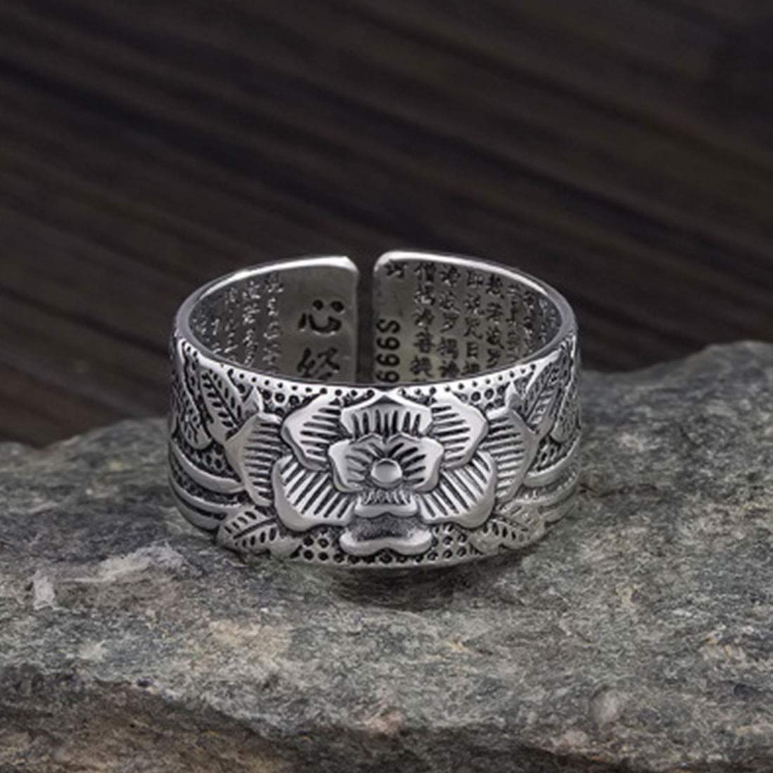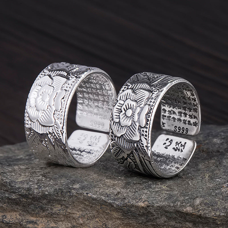 Rockyu 蓮モチーフリング メンズ レディース フリーサイズ 仏教経文刻印 シルバーメッキ