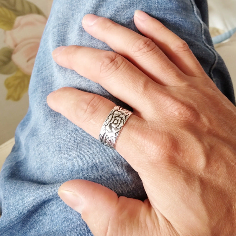 素材は高品質な銅にシルバーメッキを施し、美しい輝きとアンティークな風合いを実現。シルバー925のような高級感がありながらも、手頃な価格で楽しめるのが魅力。金属アレルギーにも配慮した仕様で、フリーサイズなので指に合わせて微調整も簡単。性別を問わず使えるユニセックスデザインで、ファッションのテイストを選ばず幅広く活躍します。