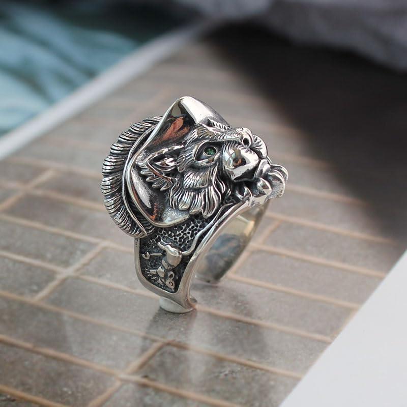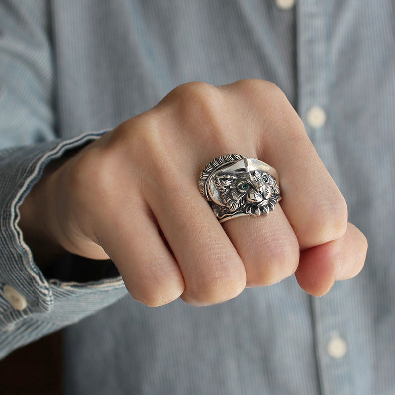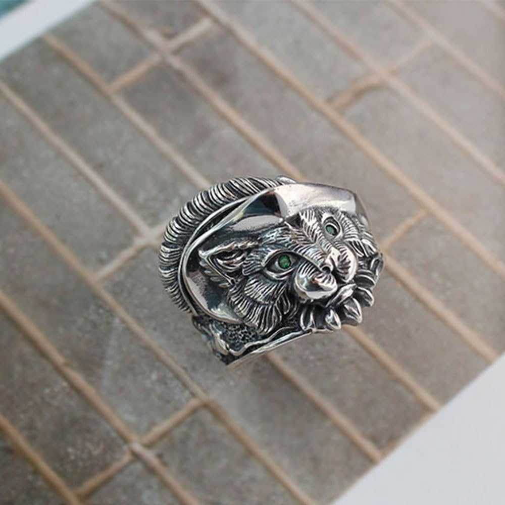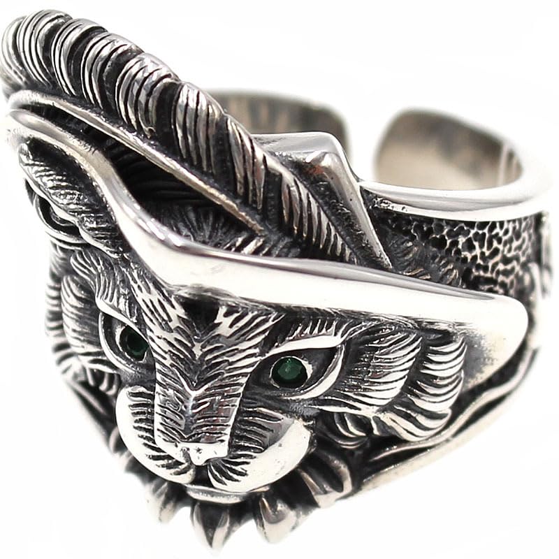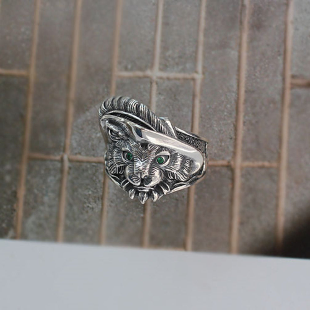 Rockyu シルバー 猫リング グリーンアイ 男女兼用 レトロ ごつめ フリーサイズ