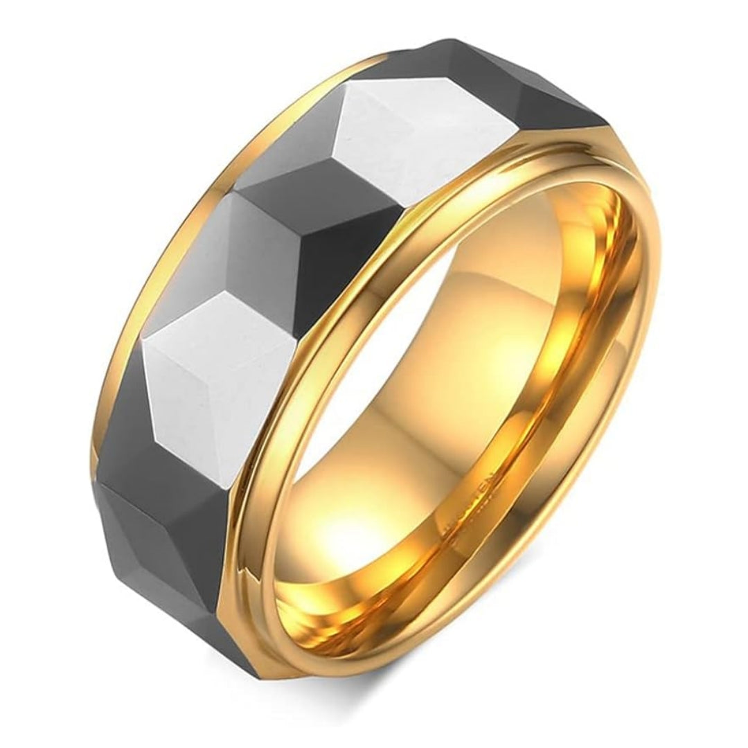 多面カットタングステンリング Rockyu メンズ指輪 8mm幅 ブラック&ゴールド 高硬度シンプルアクセサリー