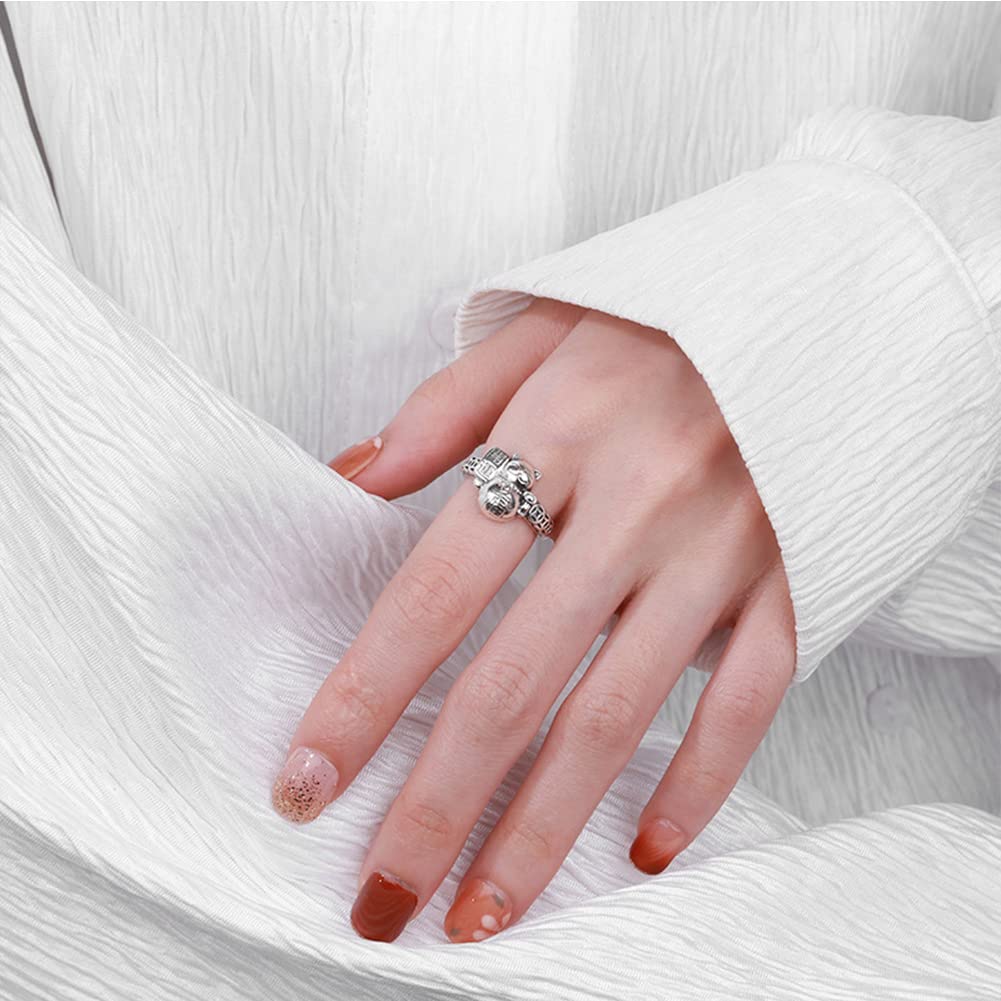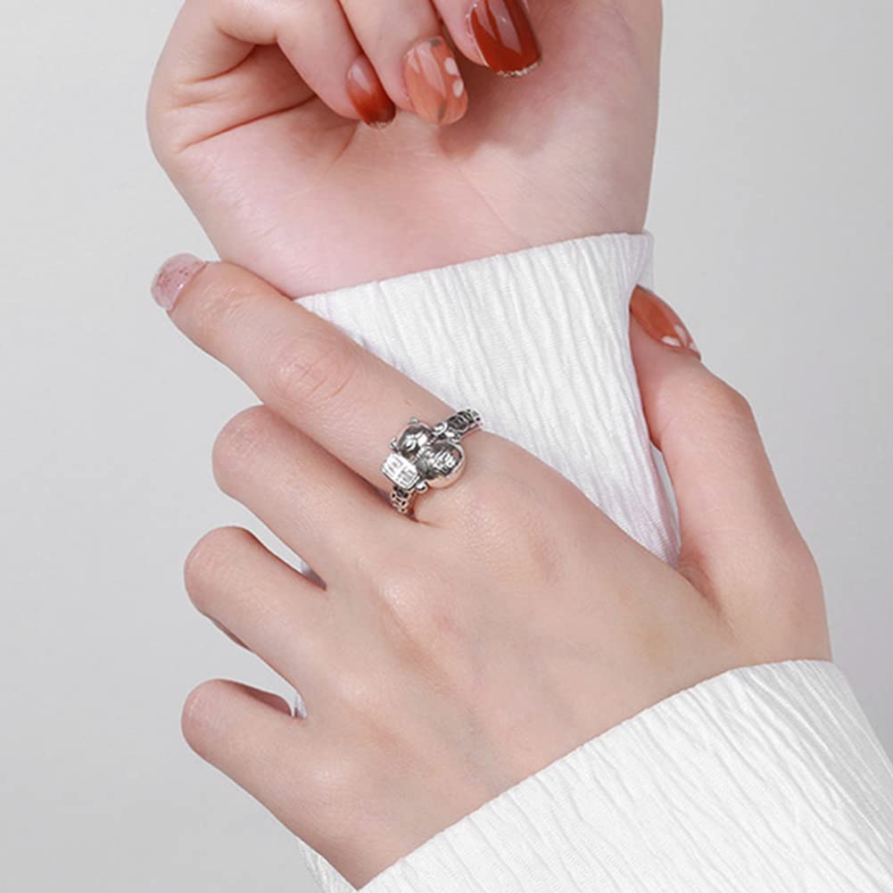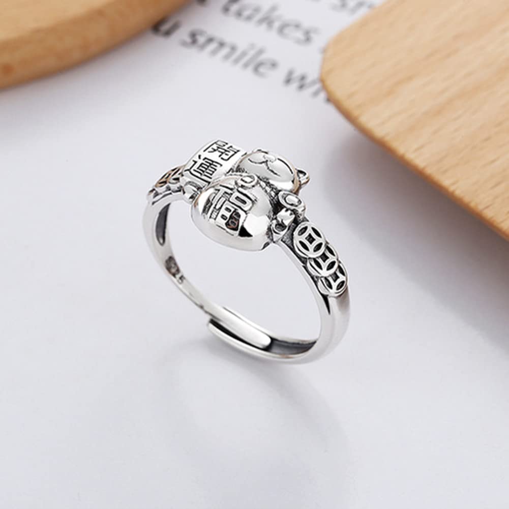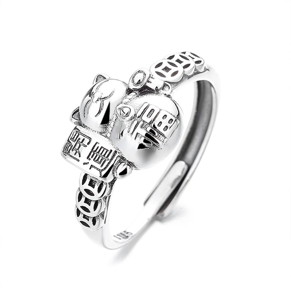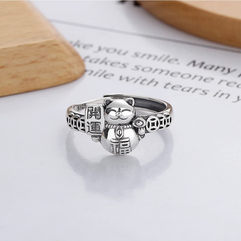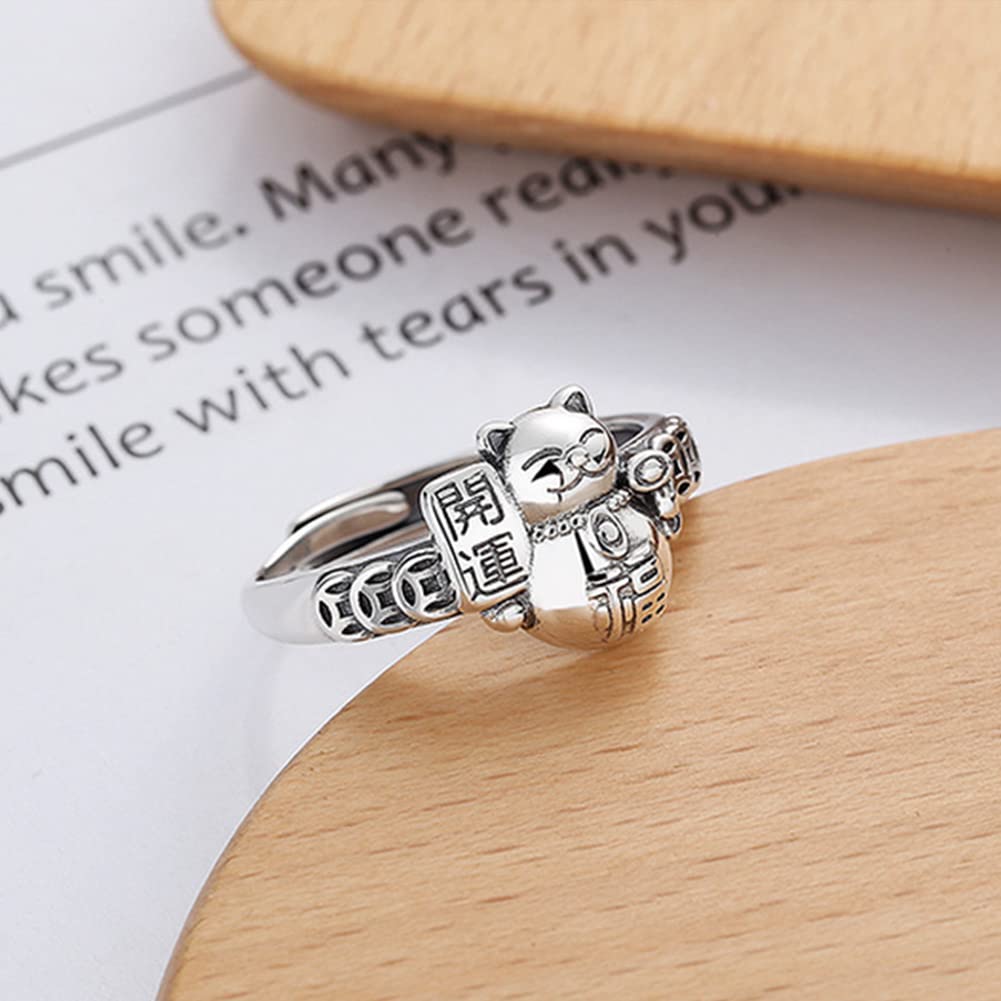 Rockyu 招き猫リング レディース フリーサイズ シルバー 銅銭モチーフ 文字刻印 調節可能