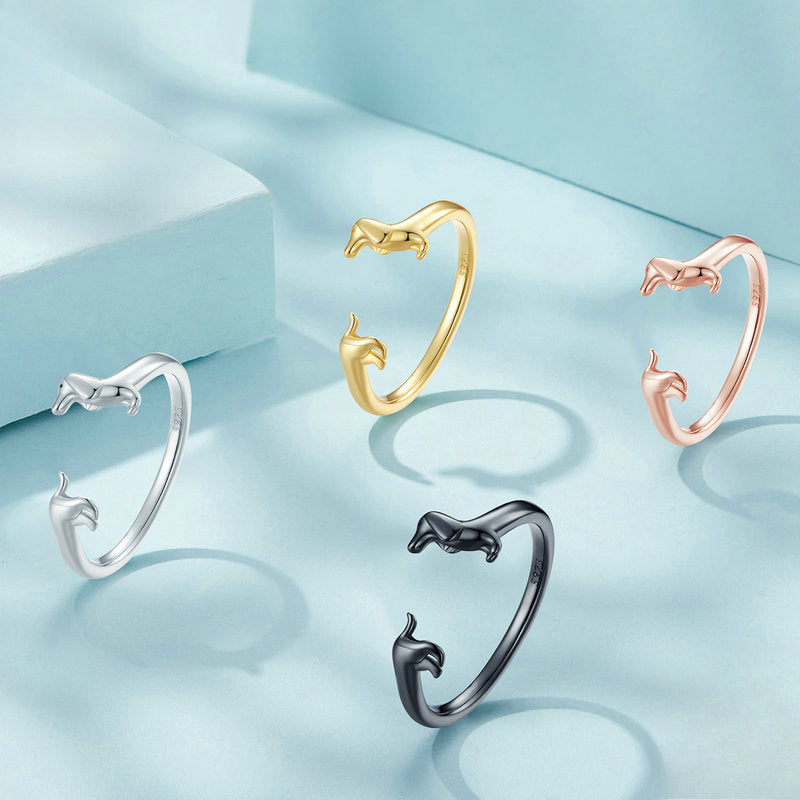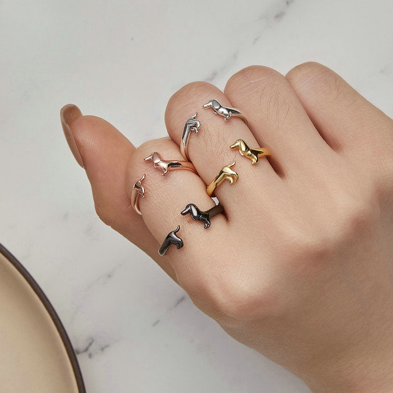 ちょこんと抱きつくような姿が愛おしい、ダックスフンドのシルエットリング。