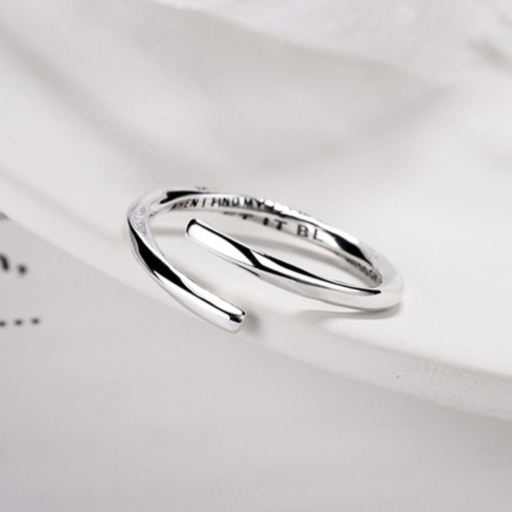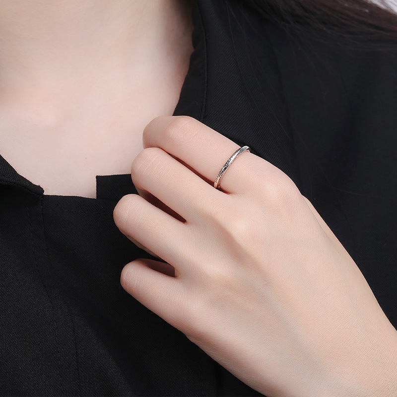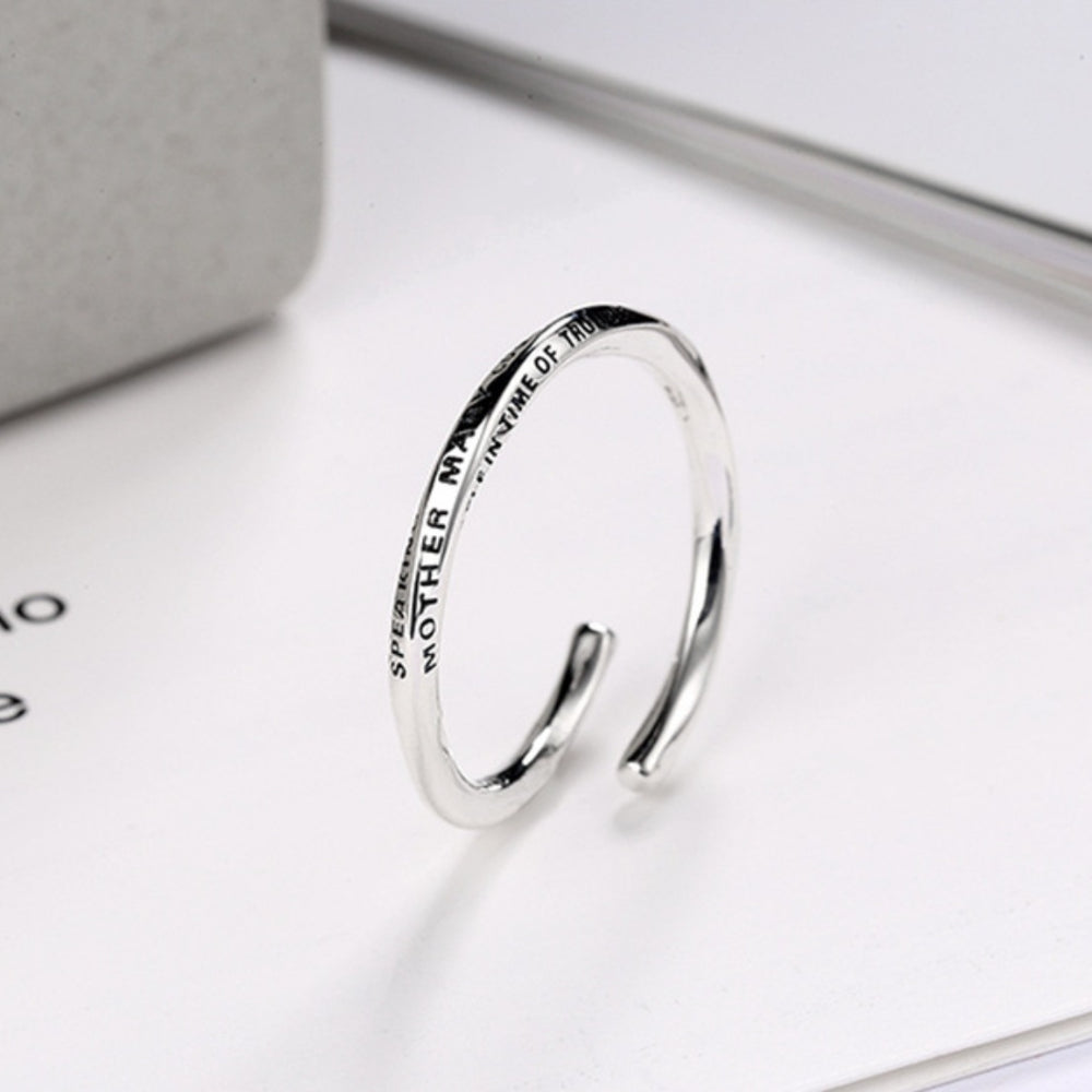 Rockyuのこのリングは、洗練されたミニマルデザインに、さりげないメッセージを刻んだ一品。輝きすぎない落ち着いたシルバー925が、日々の装いに知性と静かな存在感を添えてくれます。