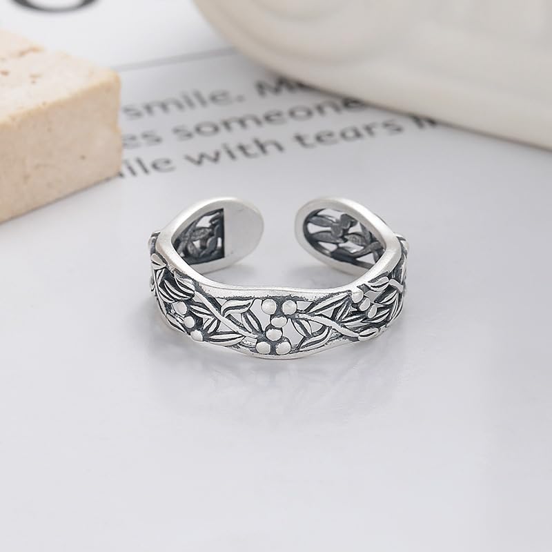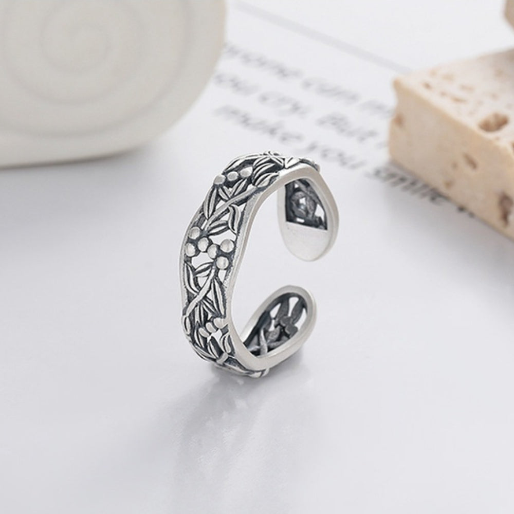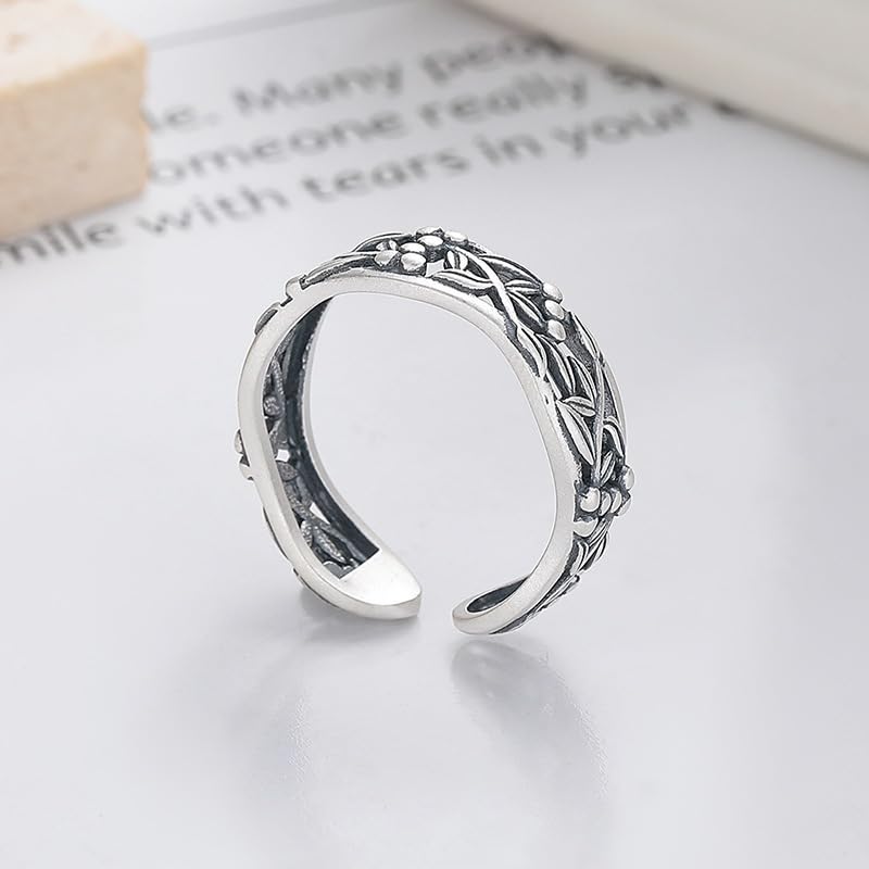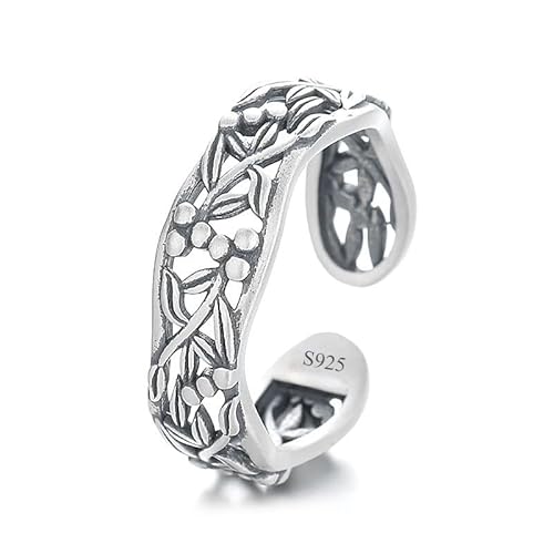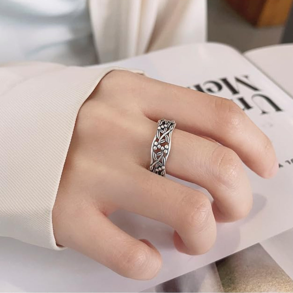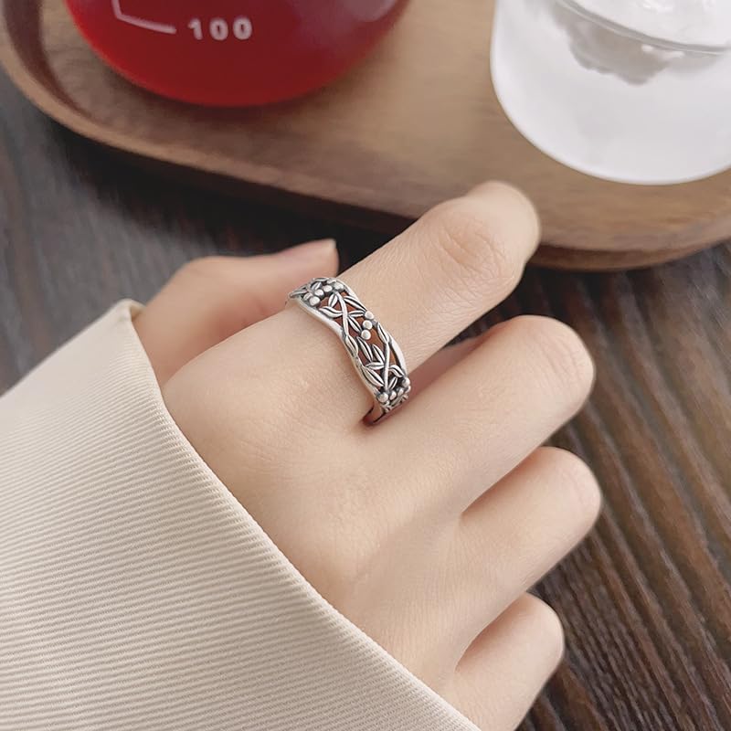Rockyu 指輪 レディース 太め シルバー925 藤蔓モチーフ リング フリーサイズ 金属アレルギー対応 透かし彫り 植物デザイン