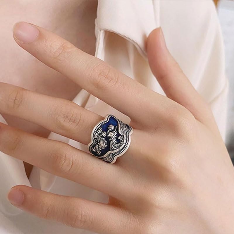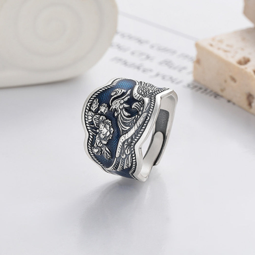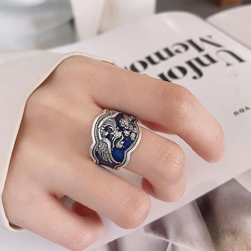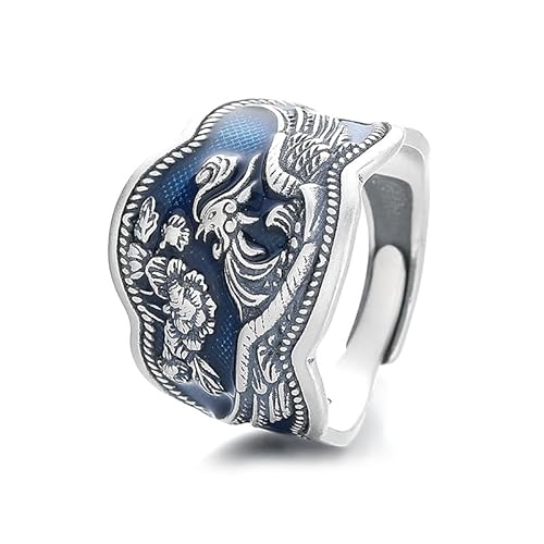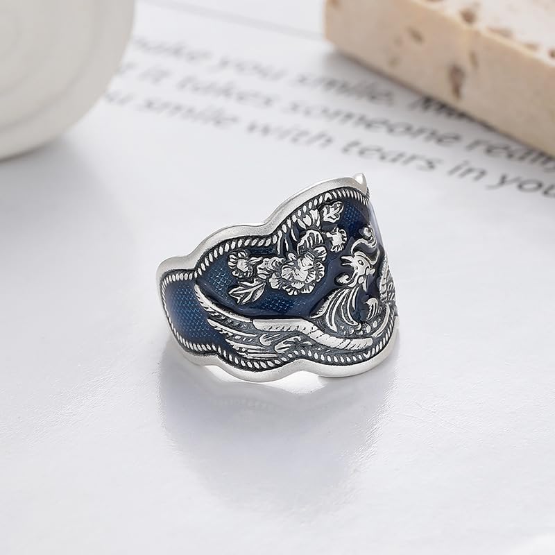 Rockyu 指輪 レディース 太め シルバー925 鳳凰&花モチーフ 青釉薬 ウェーブリング フリーサイズ 金運アップ