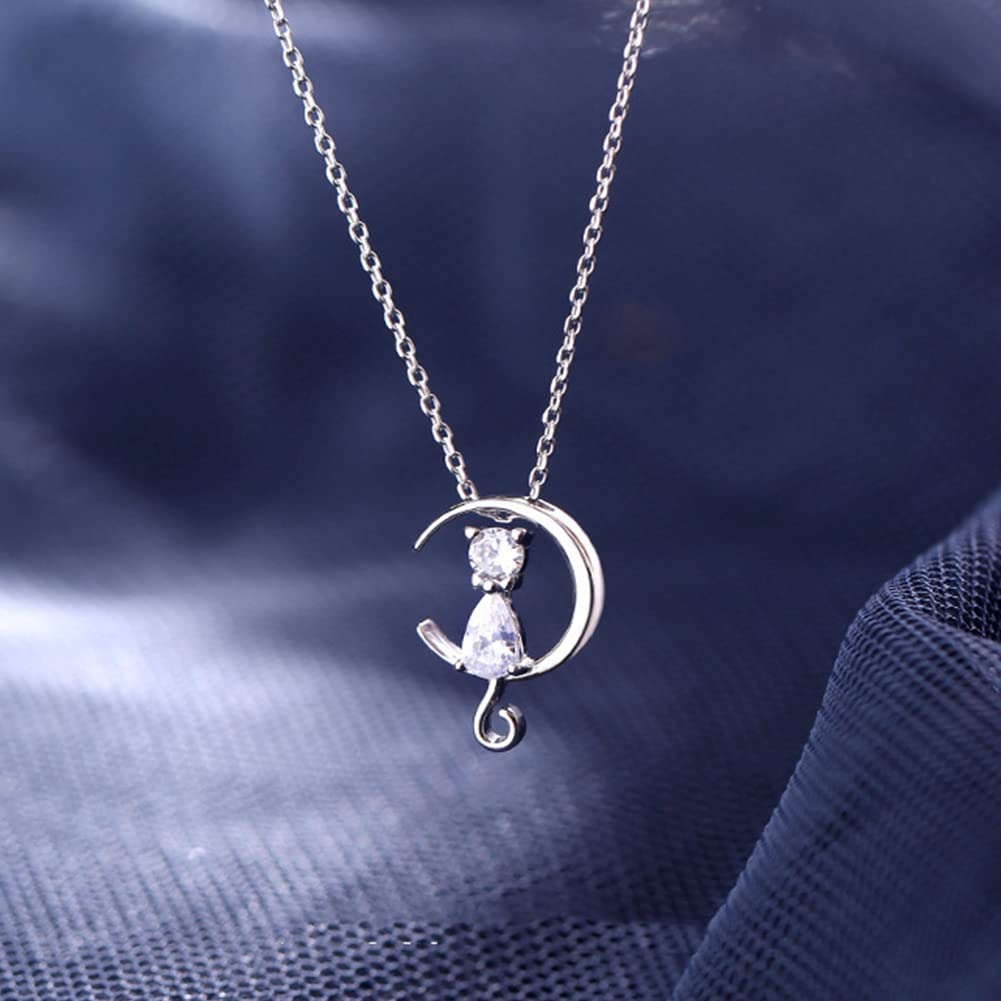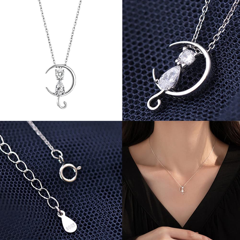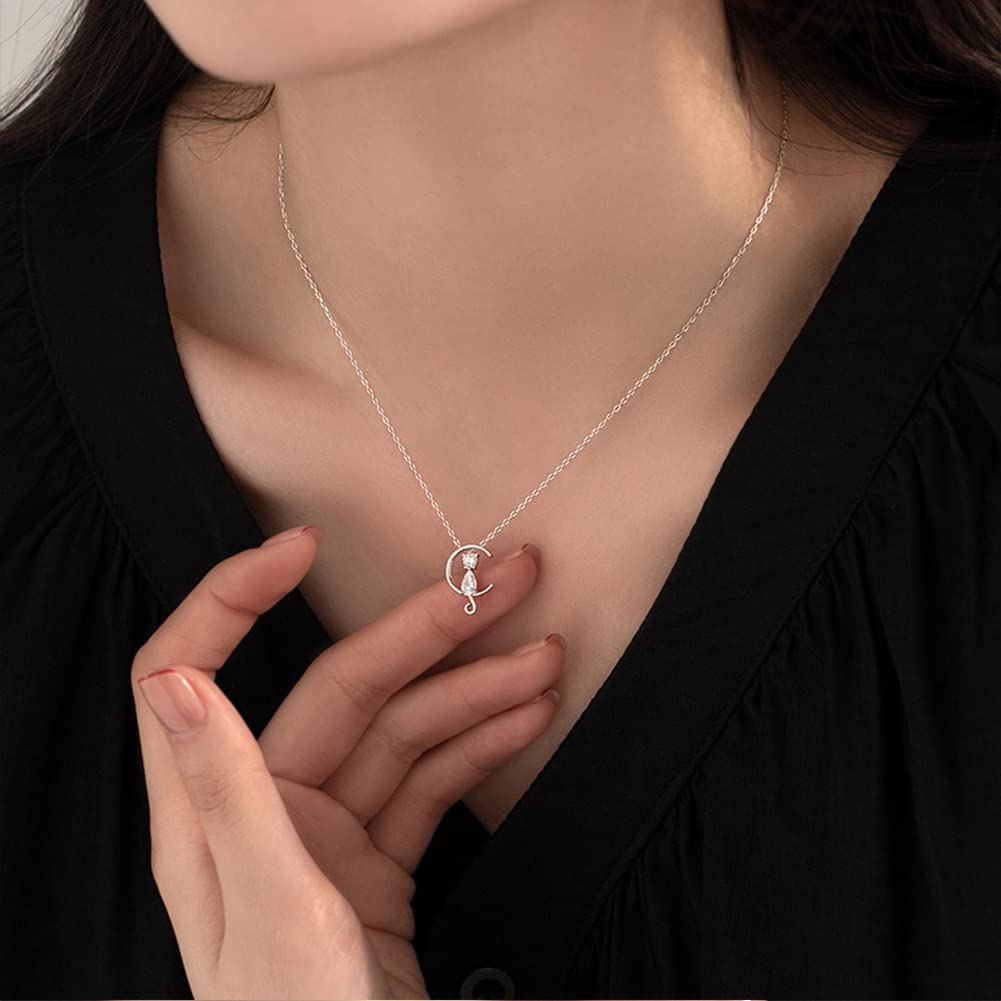 Rockyu 猫と月 ネックレス レディース 925純銀 ペンダント シンプル可愛い ジルコニア