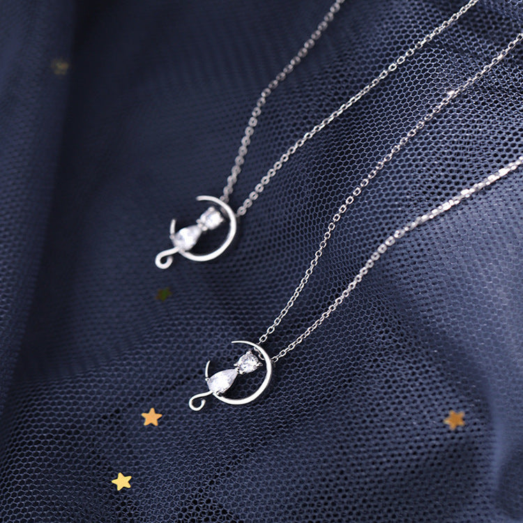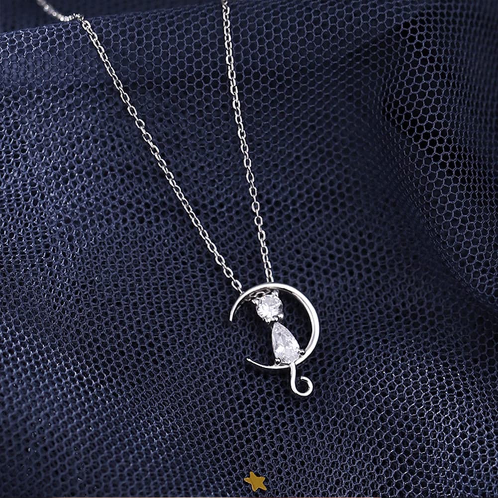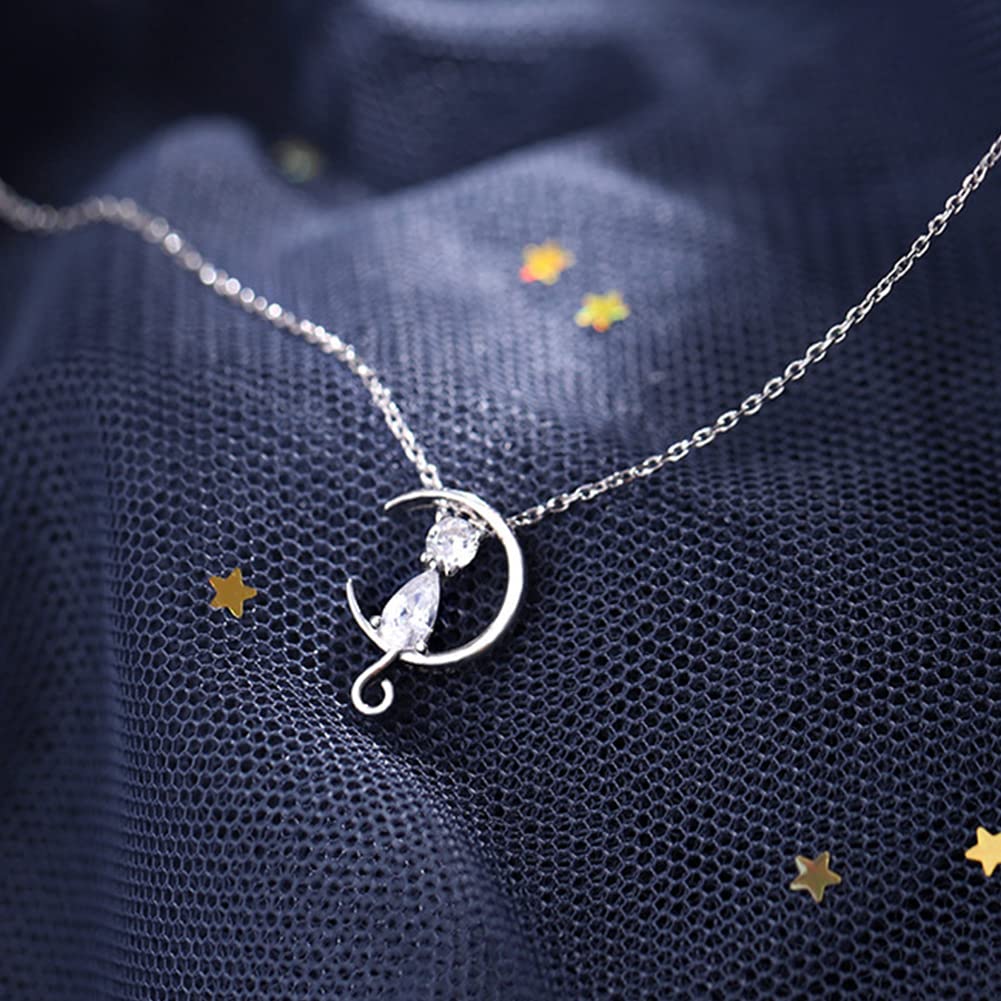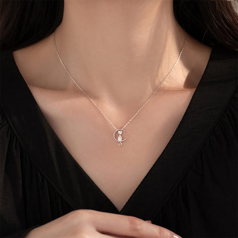 Rockyu 猫と月 ネックレス レディース 925純銀 ペンダント シンプル可愛い ジルコニア