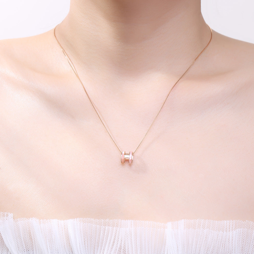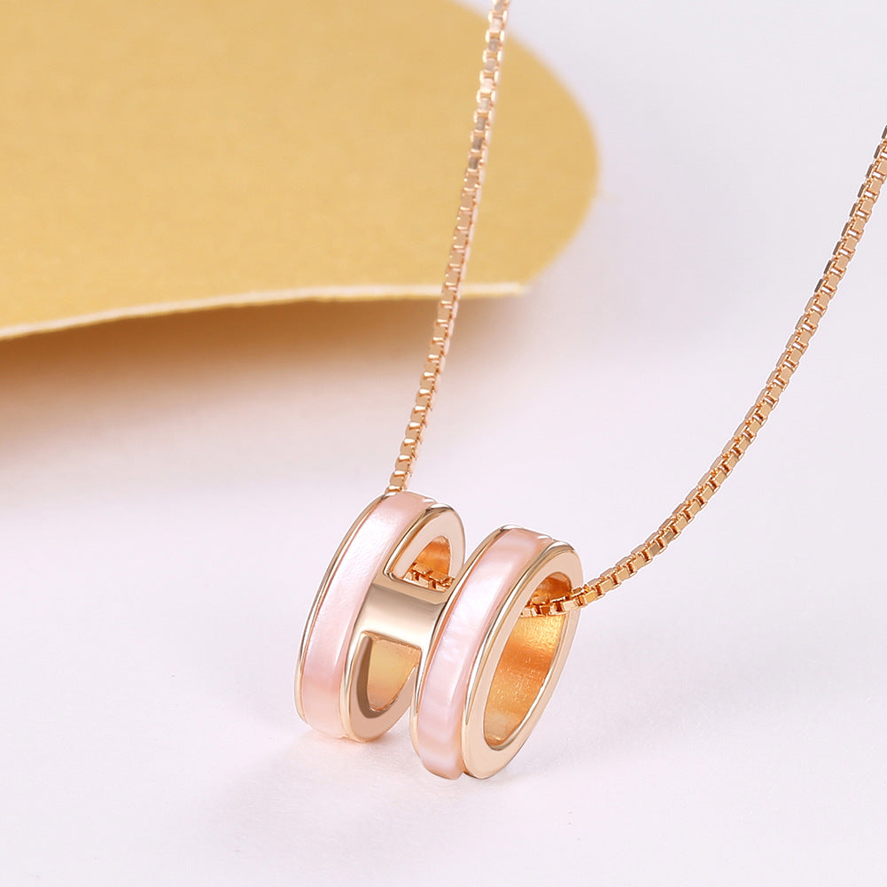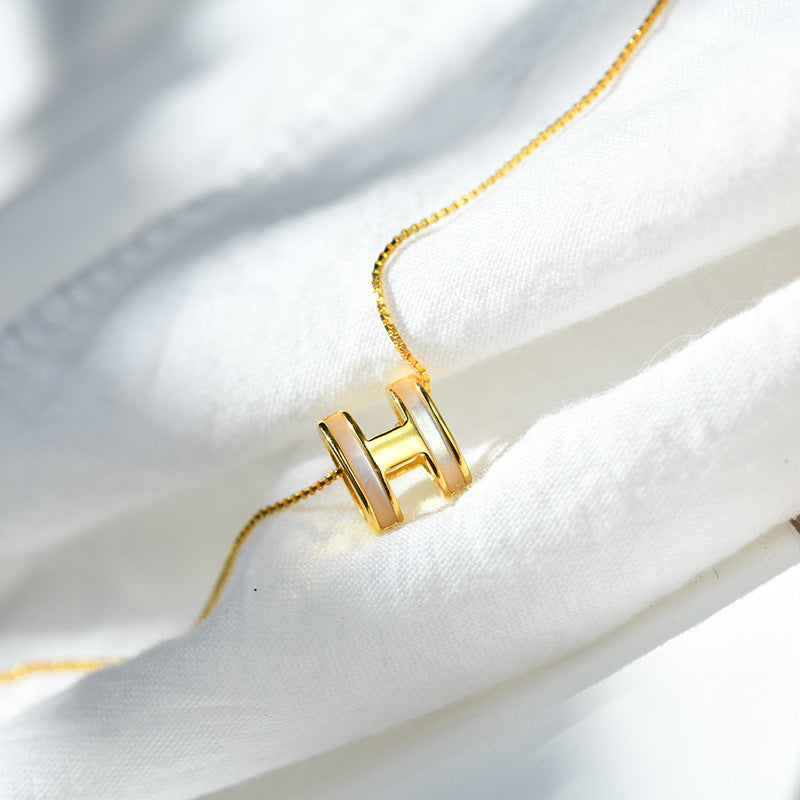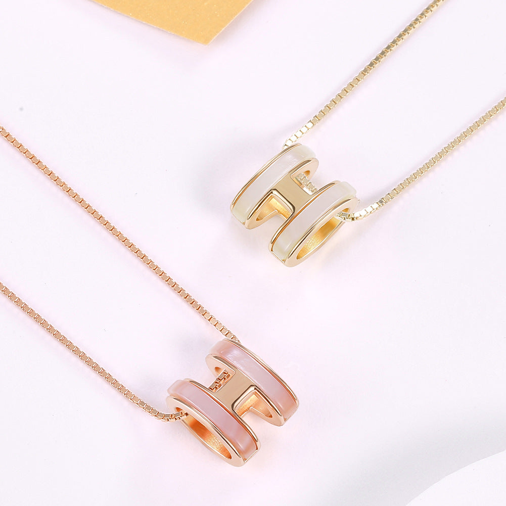 艶やかなピンクゴールドとホワイトの白蝶貝が、女性らしさと上品さを見事に両立。華奢なチェーンに繊細なH型ペンダントがきらりと揺れて、デコルテを美しく演出します。